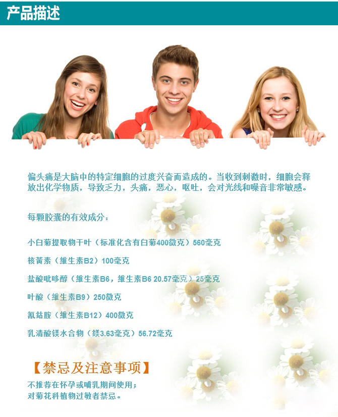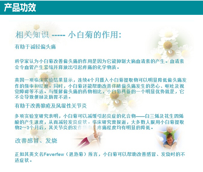 本产品所采用的小白菊,主要为缓解偏头痛,在西方治疗草药历史中已存在几个世纪。其功效有助于减轻偏头痛、恶心、呕吐,有助于改善狼疮及风湿性关节炎、改善感冒、发烧等症状。