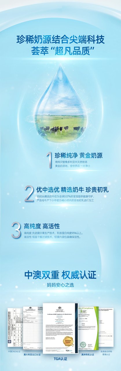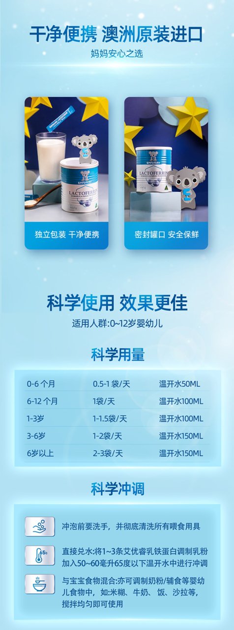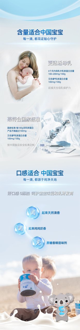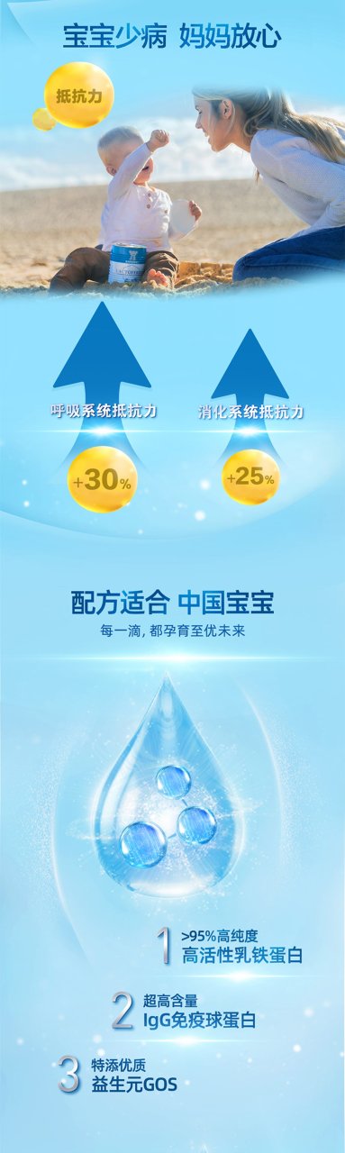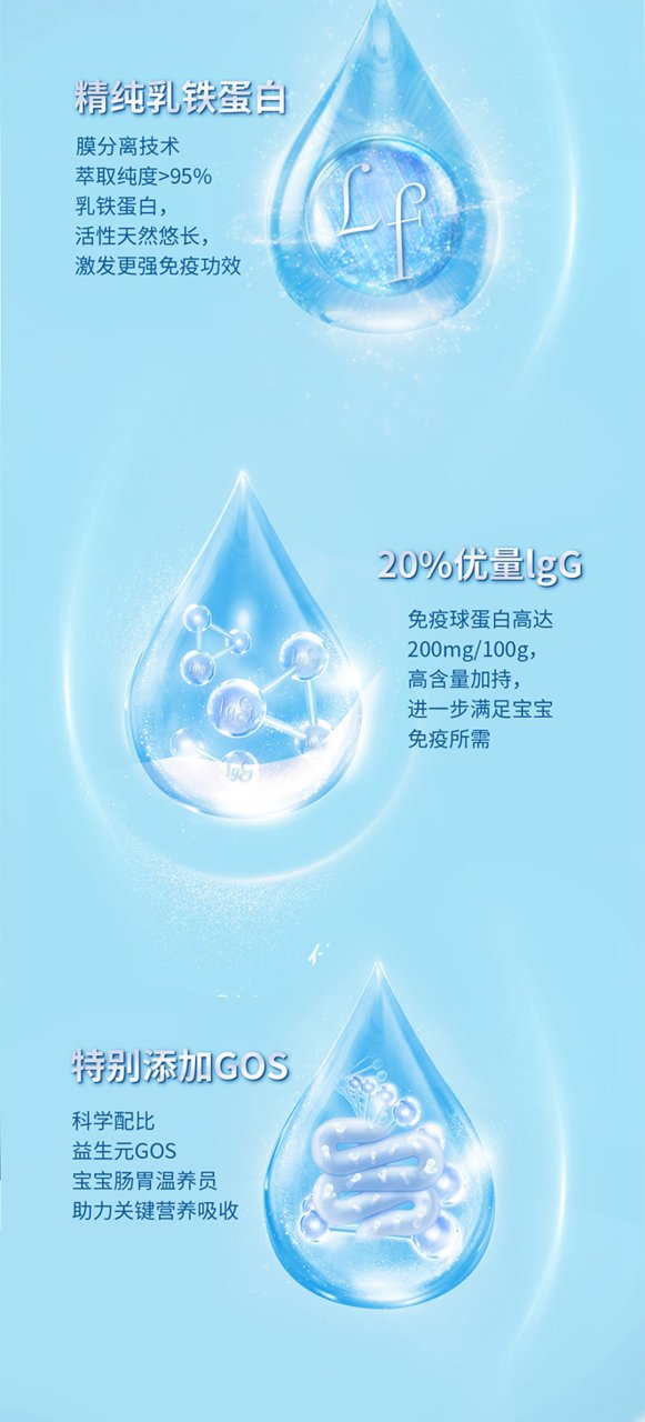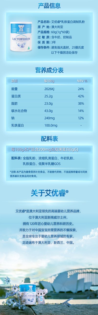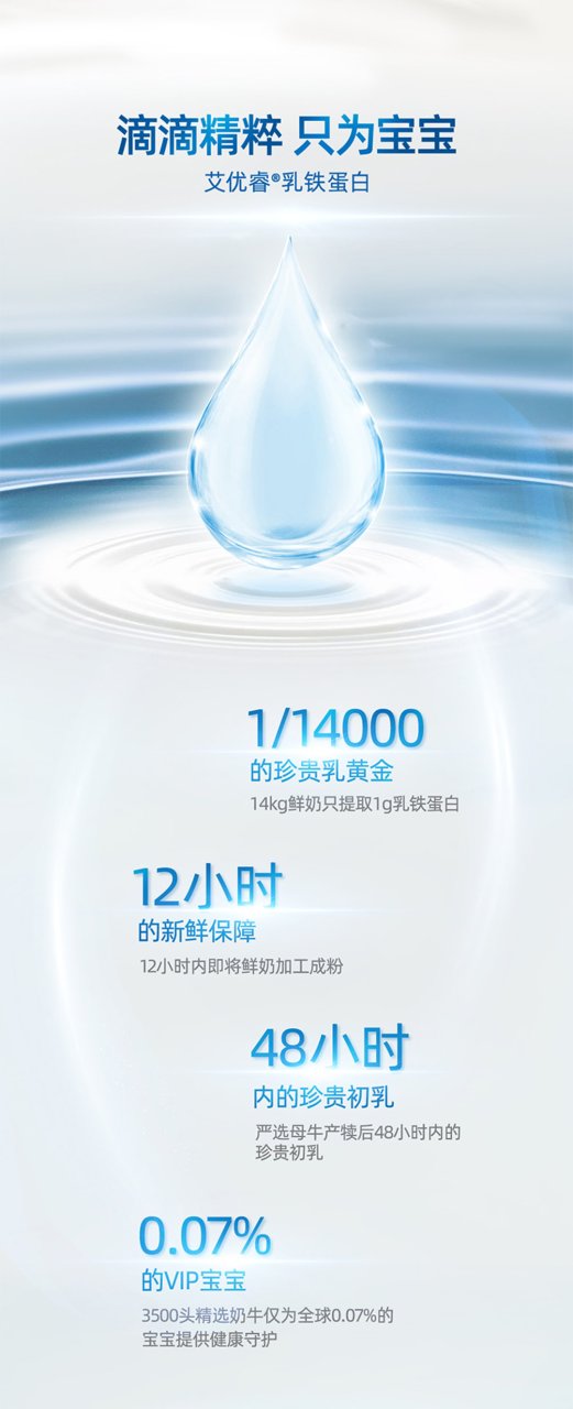 三大成分的强强联合,乳铁蛋白+免疫球蛋白IgG+益生元GOS, 给宝宝更好的免疫守护。艾优睿严格遵循6个月内母乳中乳铁蛋白含量100~200mg/100g --- 发挥母乳级别的保护力 。并确保了无蔗糖、无香精、无甜味剂,0添加、纯天然,全方位呵护宝宝的味觉和乳牙健康~