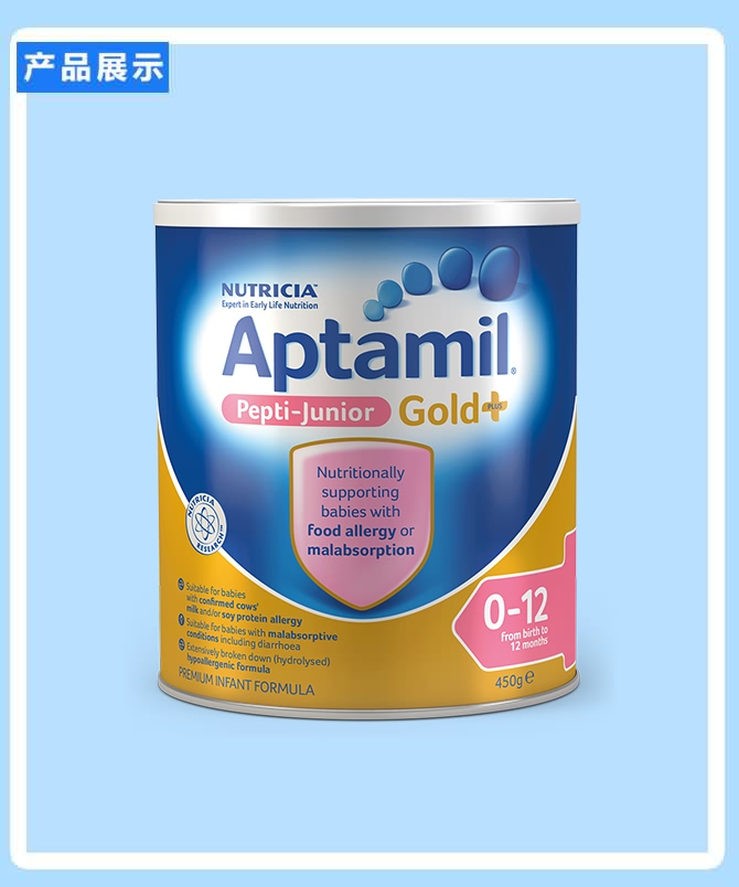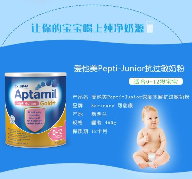 澳洲爱他美Pepti-Junior深度水解配方奶粉 〔适用〕适合0-12个月的宝宝 ,也适合全阶段宝宝;适用于对奶基(奶蛋白)严重过敏、食物过敏及对牛乳蛋白过敏的宝宝;避免由于牛乳蛋白过敏而引起的湿疹、腹泻,呼吸系统失调等;乳糖小于0.1克,适用于对乳糖不耐受而腹泻的婴儿。〔成分〕全面水解的牛奶蛋白分解成小的低敏多肽半要素配方;易于消化的脂肪混合中链甘油三脂,提高消化和吸收率;含鱼油帮助大脑和眼睛发育;含DHA、AA、中链甘油三脂、长链多不饱和脂肪酸LCP。