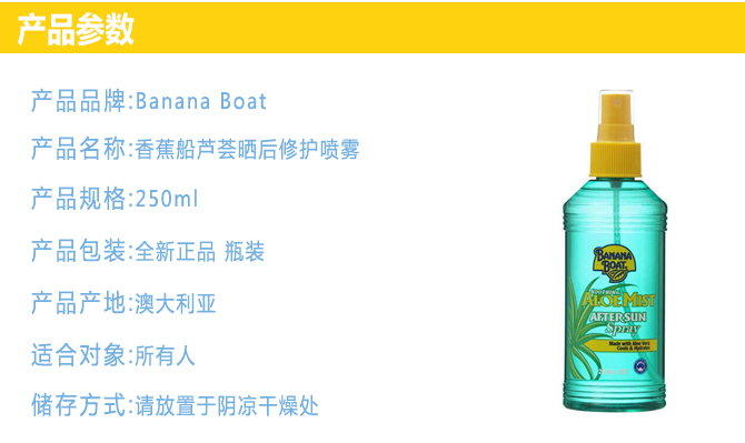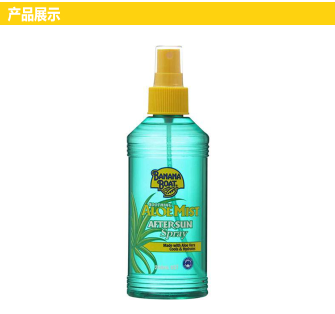 Banana Boat 香蕉船 芦荟晒后修护喷雾含有天然芦荟,能舒缓,清凉和帮助再生被晒伤的肌肤,防止晒伤后的脱皮,能有效的缓解晒伤后的皮肤灼热,痛痒和不适,镇定安抚过度日晒造成的伤害,平常也可用作保养肌肤的润肤霜,给予肌肤保湿修护。