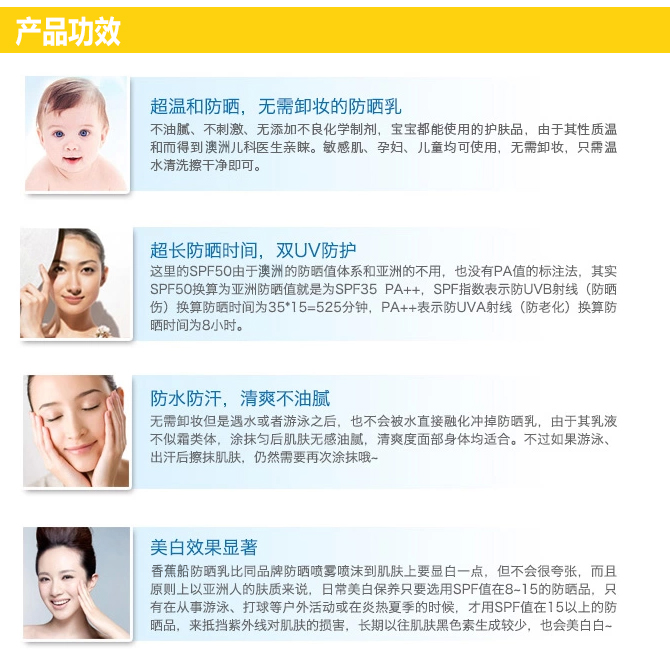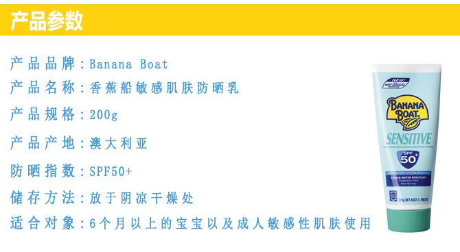 Banana Boat是最畅销的防晒品牌之一,隶属Playtex公司,是专业的防晒品牌。该品牌占全球防晒品5%的市场份额,Banana Boat去年在美国的销售额排名第二,达到8940万美元。由皮肤科医生测试,独家Powder-Dri技术,让涂上去乳状的防晒品魔术般地干爽如粉状,告别油腻,干爽透气。更有尖端的AvoTriplex光稳定保护技术,犹如一把保护伞,抵御紫外线对皮肤的伤害。