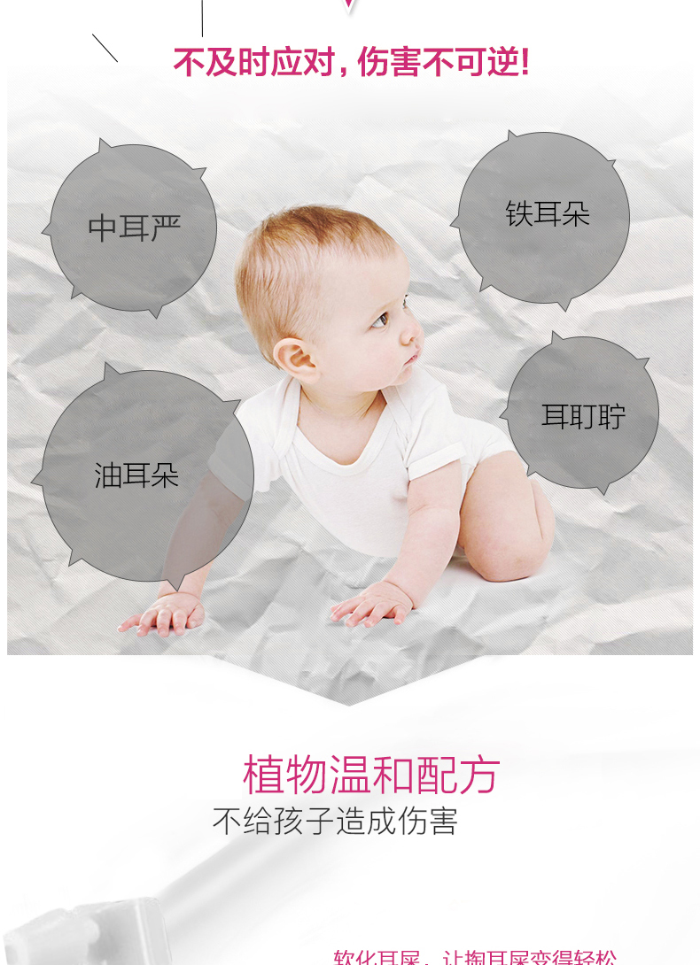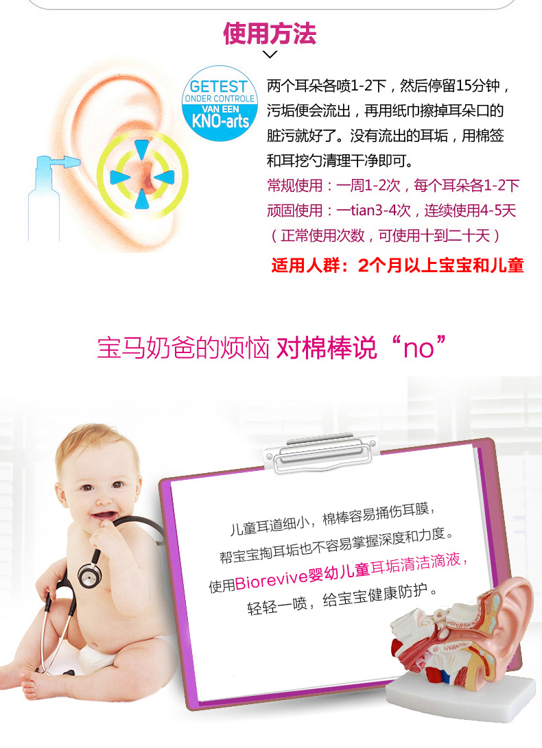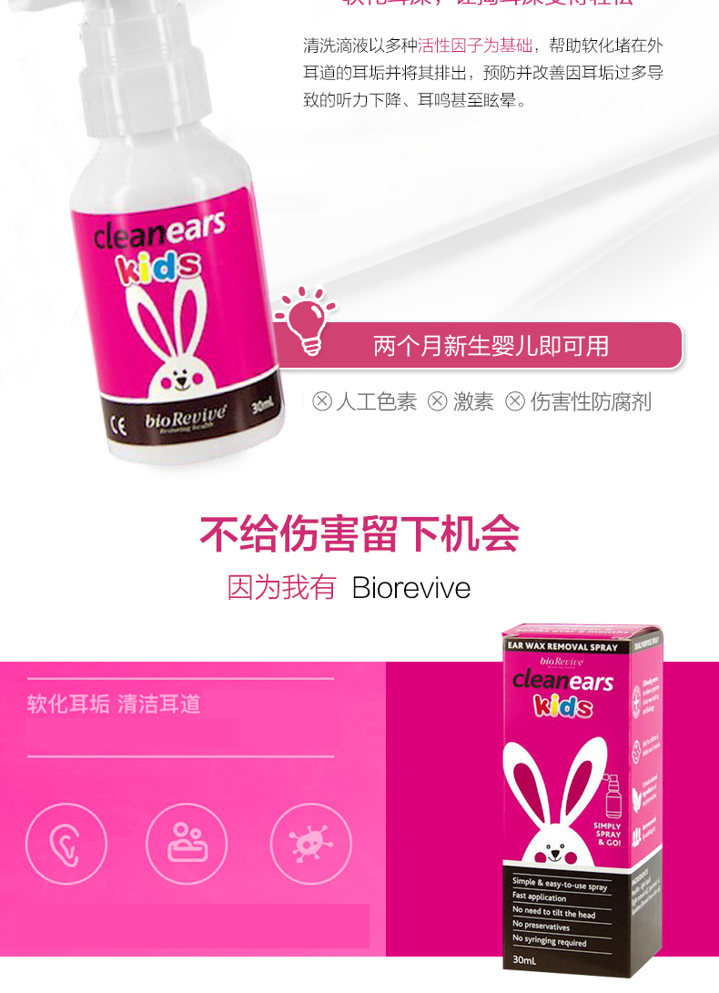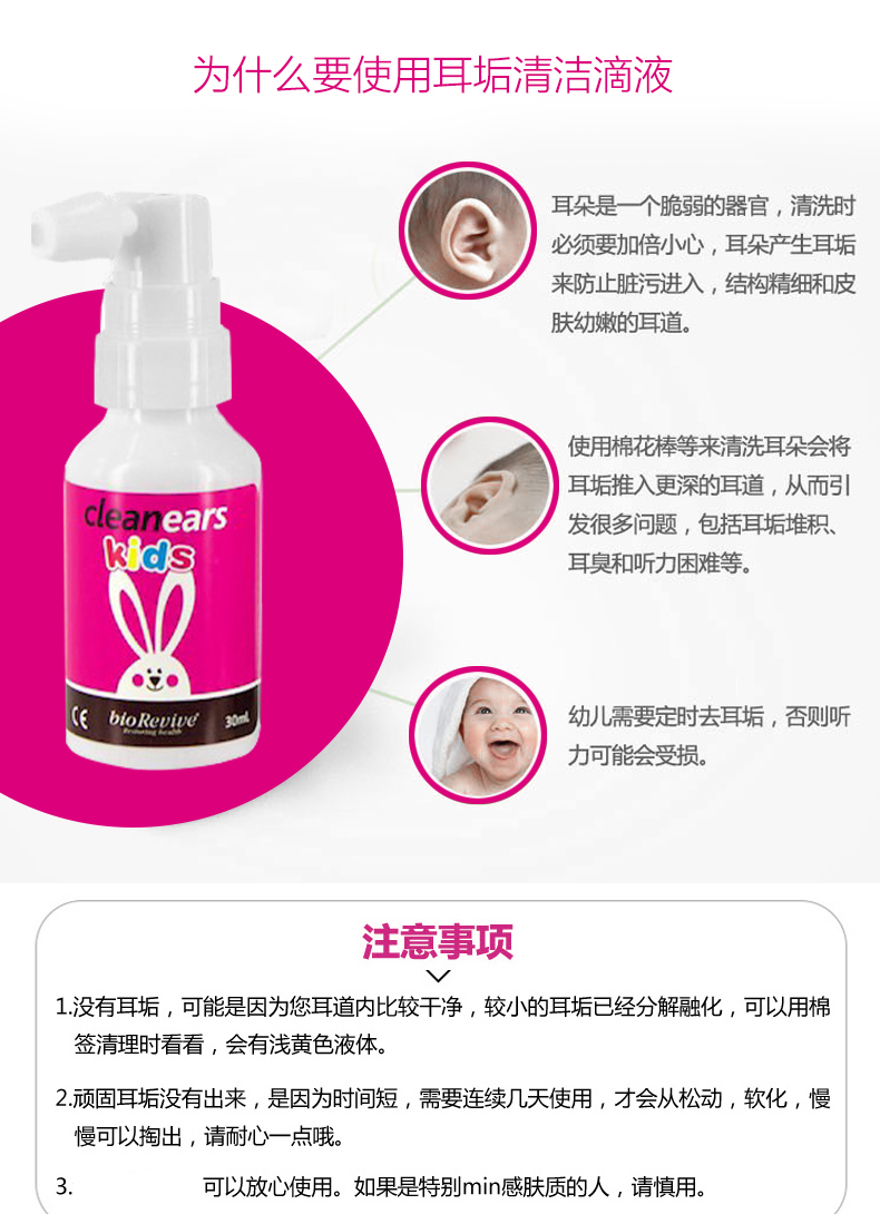 CleanEars 耳垢清除喷雾是一款安全温和、能有效清洁耳朵的清除喷雾,富含角鲨烯和矿物油等营养成分,有助于润滑及分解过多的耳垢,滋润耳道以舒缓因耳垢摩擦而造成的皮肤损伤。本产品使用起来非常方便,并且减少了由医生使用洗涤器进行清洗耳道的需要。喷雾具有安全的喷头形状,防止深入耳朵,伤害耳道耳膜,能够替代棉签、掏耳勺等可能对耳朵造成伤害的工具。清新的薄荷油成分散发出淡淡的薄荷味,给人们带来一个舒适的听力状态。