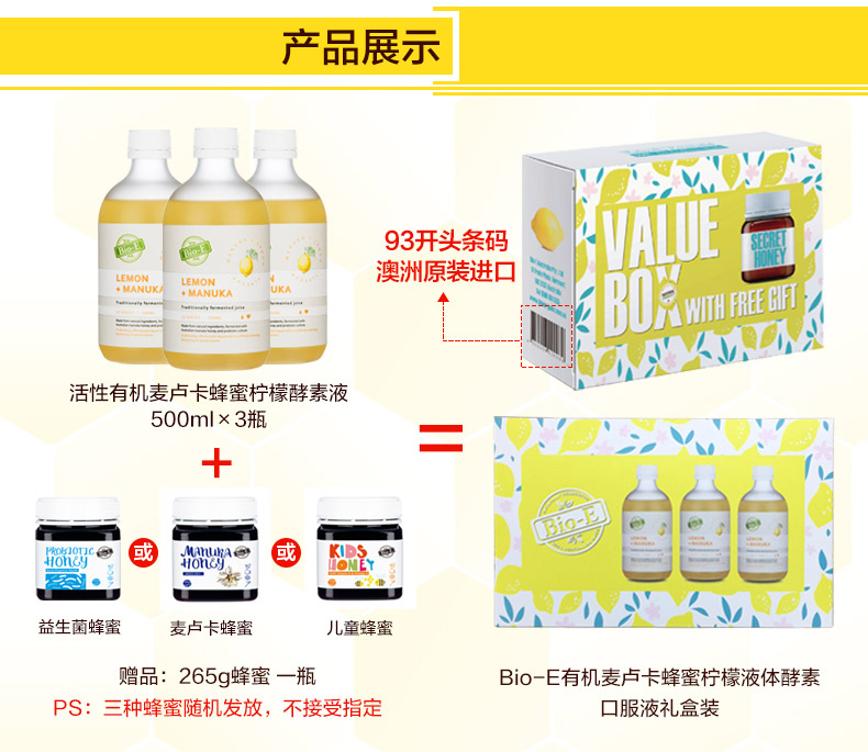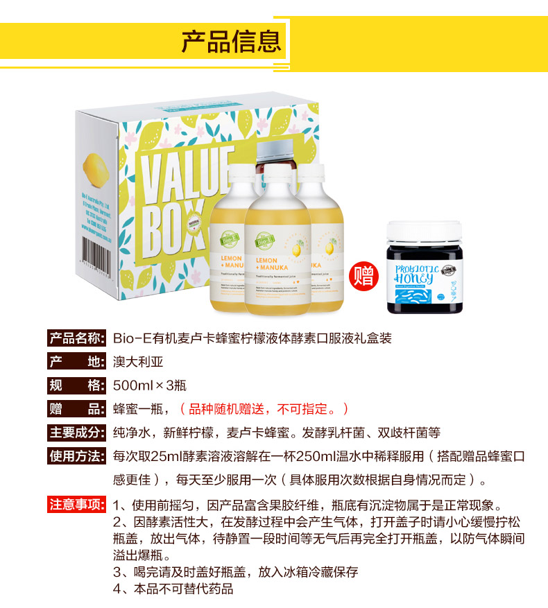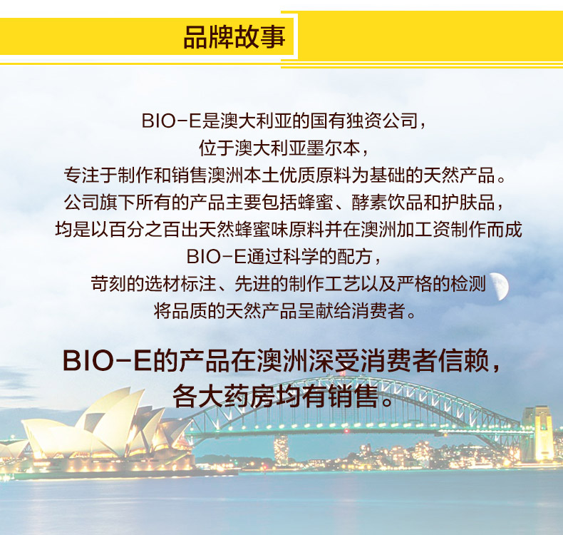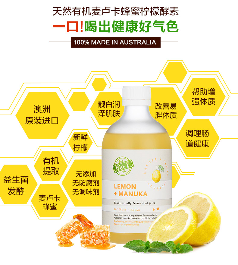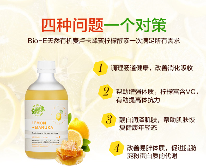 Bio-e柠檬酵素,澳洲纯天然制造,用最纯净的水质,最新鲜的有机水果发酵。柠檬有很大的美白功效,如果想美白祛斑,可以喝又可以当面膜敷,或者混柠檬蜜一起好喝又润肠。柠檬酵素有助于消化系统的正常运行,促进对脂肪、蛋白质及碳水化合物的消化。同时包含来自新西兰的麦卢卡蜂蜜,改善消化不良,提高免疫力。