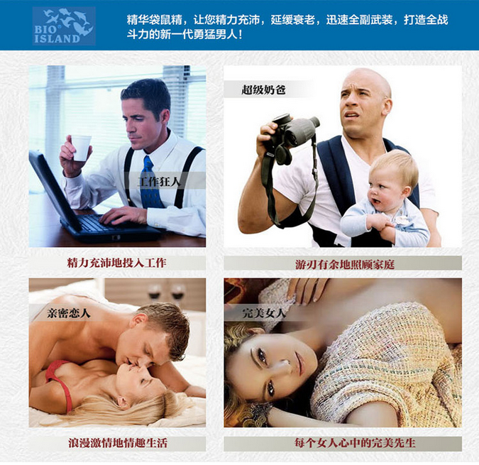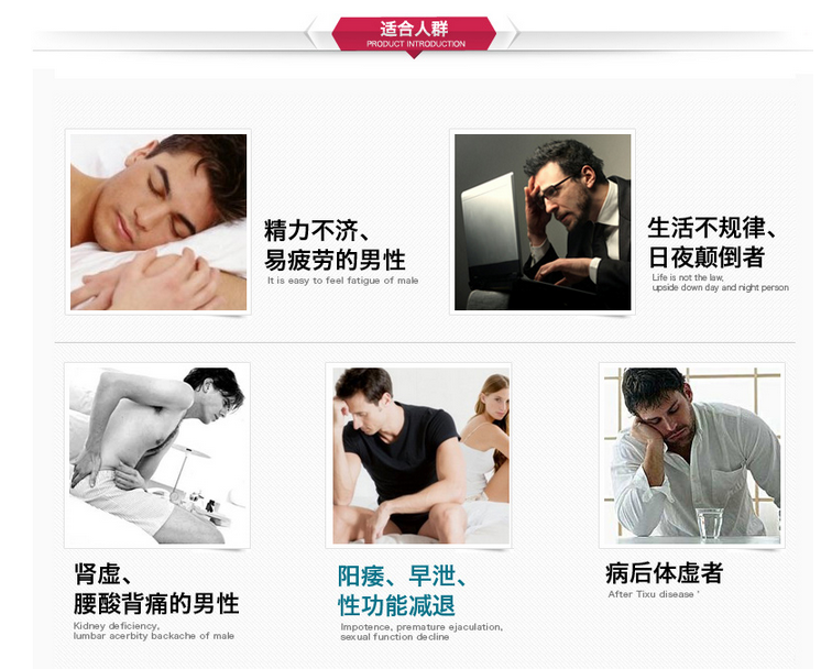 本产品可增强男性强效持久,增强新盖体验,增强活力,延缓衰老。适用于阳痿早泄、性功能障碍的男性。适用于精力不济、易疲劳的成年男性,长期体弱、肾虚、起夜、急需滋阴补阳、或饮食不合理导致缺锌元素的人群。欲追求完美性爱享受的年轻群体以及回味激情时刻的中老年群体。