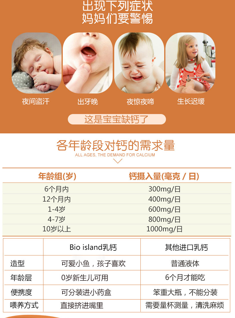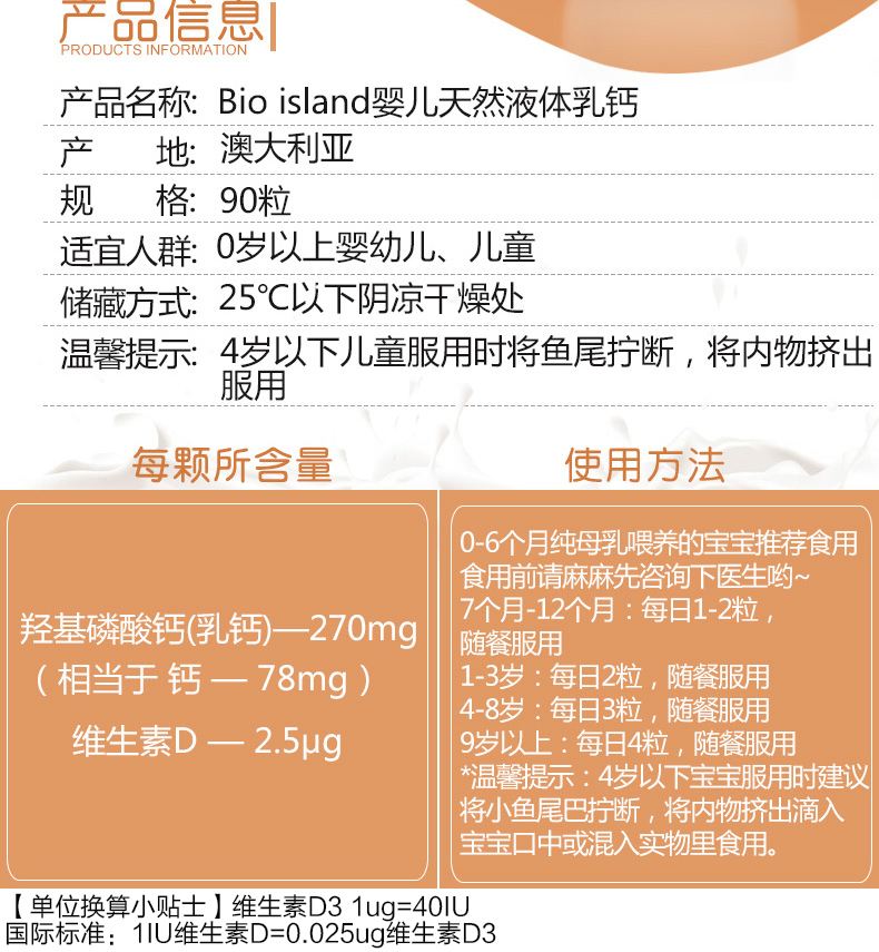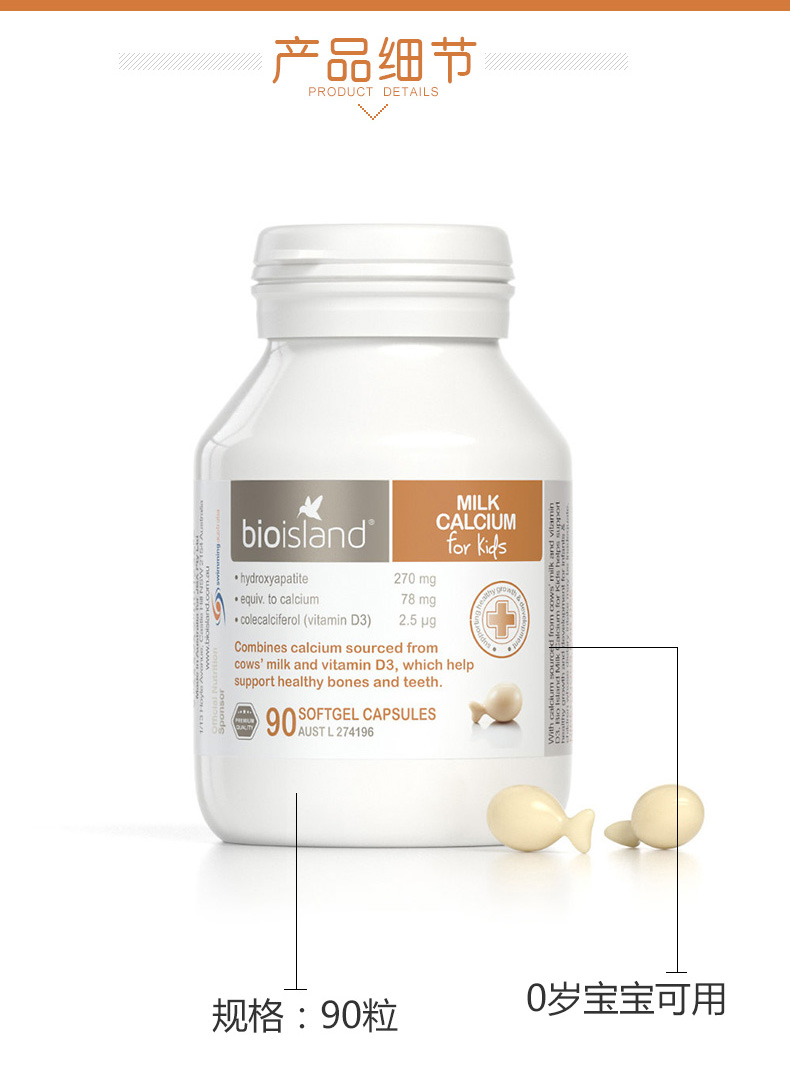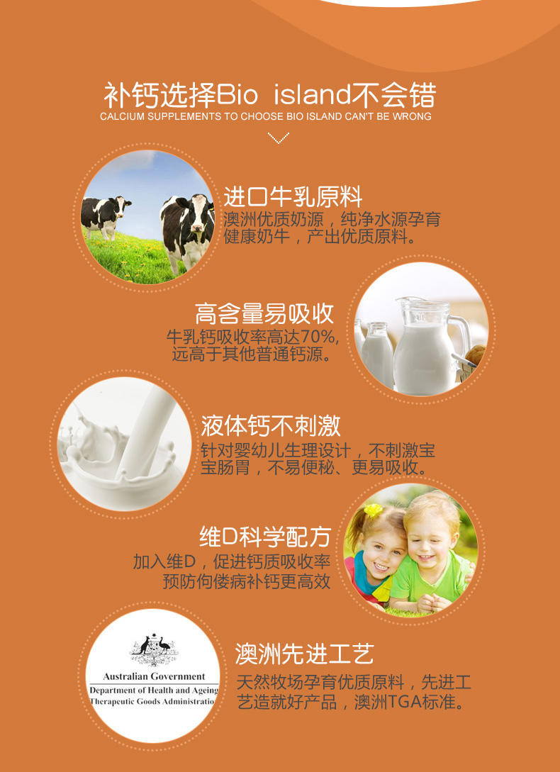 【运输途中气温变化可能导致产品融化,建议走EWE,如遇融化,签收72小时内提供破损物品与外包装合照(需清晰识别面单),可向EWE申请售后理赔,我司不参与理赔】Bio Island 全天然婴幼儿牛乳提取液态纯乳钙是一种胶体磷酸钙,广泛存在于人体和牛乳中,人体内主要分布于骨骼和牙齿中,牛乳主要分布于酪蛋白胶粒和乳清中,人体对钙的吸收是一个复杂的过程,人体对动物乳汁中天然的钙最容易吸收。
