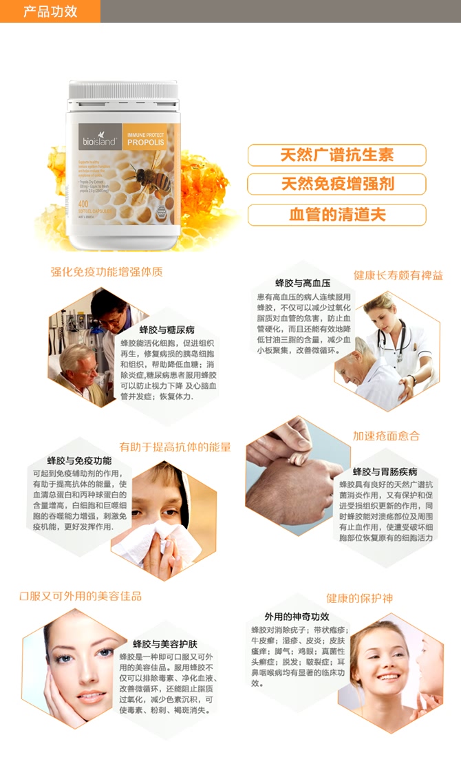 蜂胶所含有的丰富而独特的生物活性物质,使其具有抗菌、消炎、止痒、抗氧化、加强免疫、降血糖等多种功能,对人体有着广泛的保健作用。