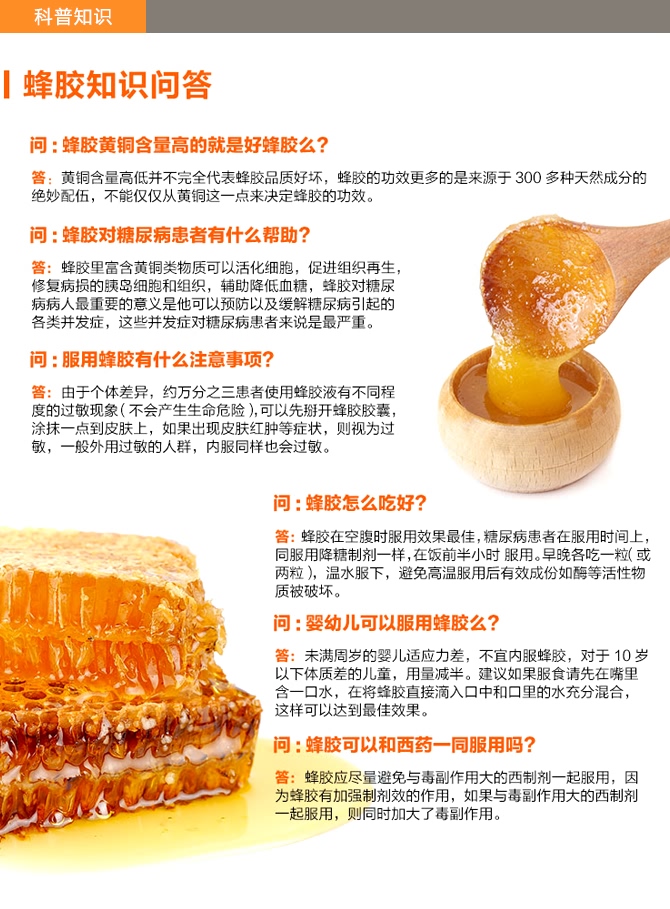 | 功效 | 蜂胶能活化细胞,促进组织再生,修复病损的胰岛细胞和组织,帮助调节血糖;蜂胶可起到免疫辅助剂的作用,有助于提高抗体的能量;蜂胶对细菌、真菌、病毒、原虫有抑制或杀灭作用等 |