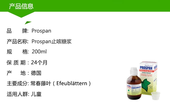 Prospan是Engelhard开发的由植物中提取的纯天然药物,主要成分是常春藤叶(Efeublättern)干提取物 ,该品主要用于支气管炎和慢性呼吸道感染的治疗。这款止咳糖浆是德国幼儿医生经常推荐的一种止咳糖浆,包装内有带有刻度的量杯,方便给药。