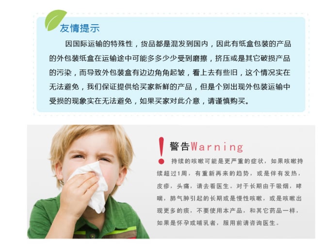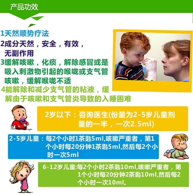 | 功效 | 专门针对婴幼儿的止咳糖浆,纯天然,不含酒精,能有效快速的缓解感冒等各种病因引起的咳嗽,舒缓咽喉肿胀,消除炎症,有效的抑制习惯性干咳。对大人也很有效。包装内有带有刻度的量杯,可以方便准确的给药。这款糖浆不含任何激素,不上瘾,也不会产生药物依赖。 |