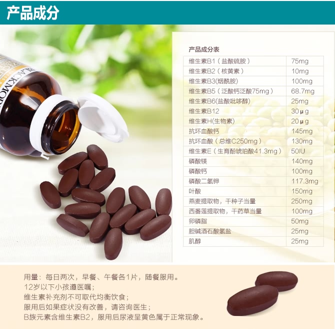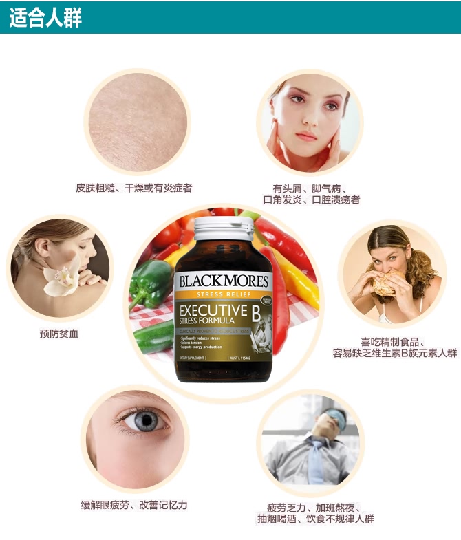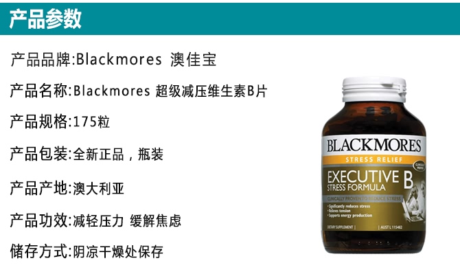 Blackmores Executive B复合维生素B抗疲劳营养片的抗压配方;有助舒缓压力和紧张,维持体内维生素和矿物质的平衡,有效舒缓因工作压力引致的情绪问题、烦躁和情绪波动。维生素C、B6、 B5、锌和镁对维持肾上腺的功能十分重要,一直被视为「抗压」维他命。叶酸和B6等都可增进情绪荷尔蒙血清素的分泌,磷酸镁是传统的药方,用于舒缓神经紧 张和焦虑。该产品里的活性成份已被临床试验证明 它可有效减轻压力和日常工作所引发的焦虑紧张等等不适情绪!
