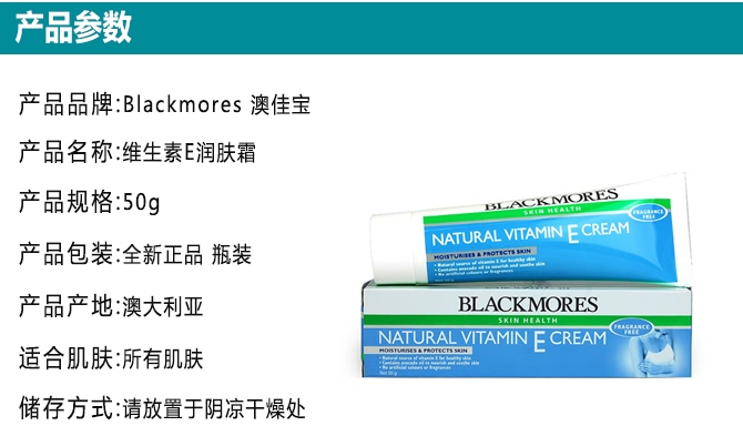 Blackmores 维他命E润肤霜配方不含人造色素或香料,采用纯正天然成份,包括天然维他命E、 牛油果油、杏核油以及维他命A,能够保湿和滋润肌肤,令肌肤变得柔滑,舒缓干燥引起的不适,能够很好的滋润肌肤。