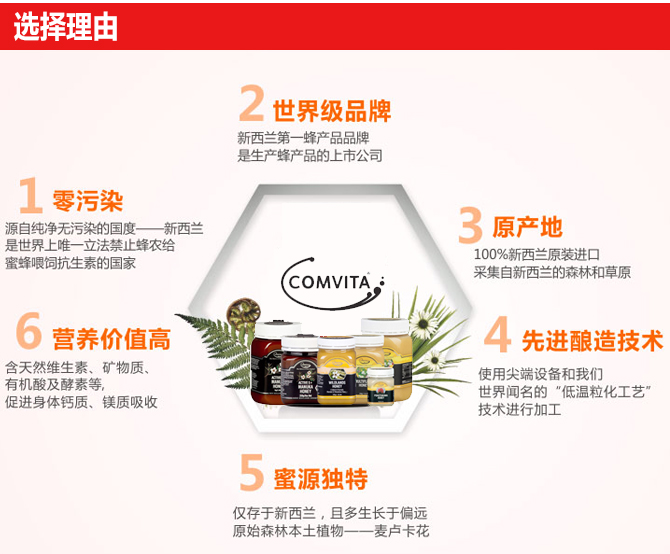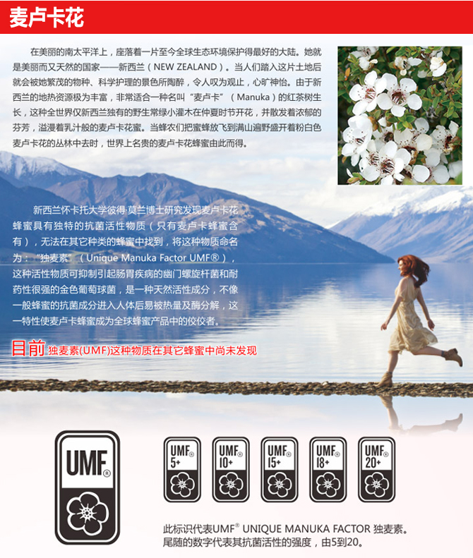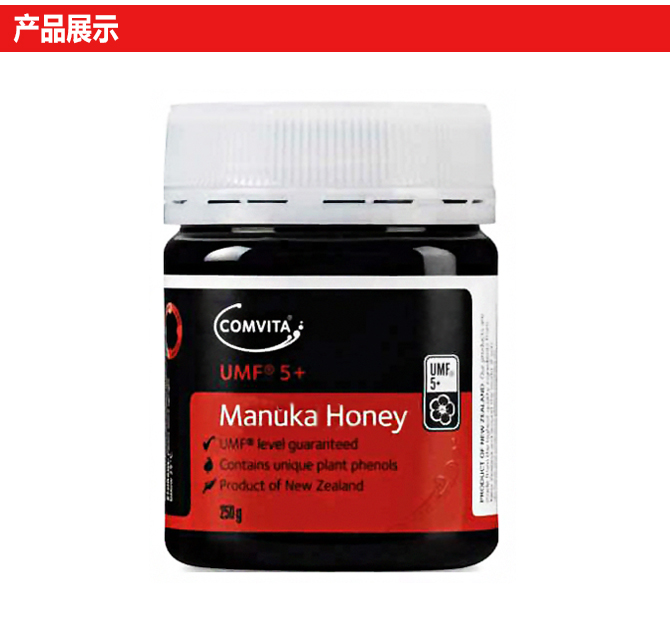 康维他活性麦卢卡蜂蜜UMF10+,15+,20+含有天然独麦素(UMF),它是由纽西兰怀卡托大学教授皮得.莫兰博士发现的一种特殊的无过氧化氢抗菌活性物质.目前未有在任何其它蜂蜜中发现UMF TM物质,致使UMF TM麦卢卡成为世界上最珍贵的蜂蜜之一。