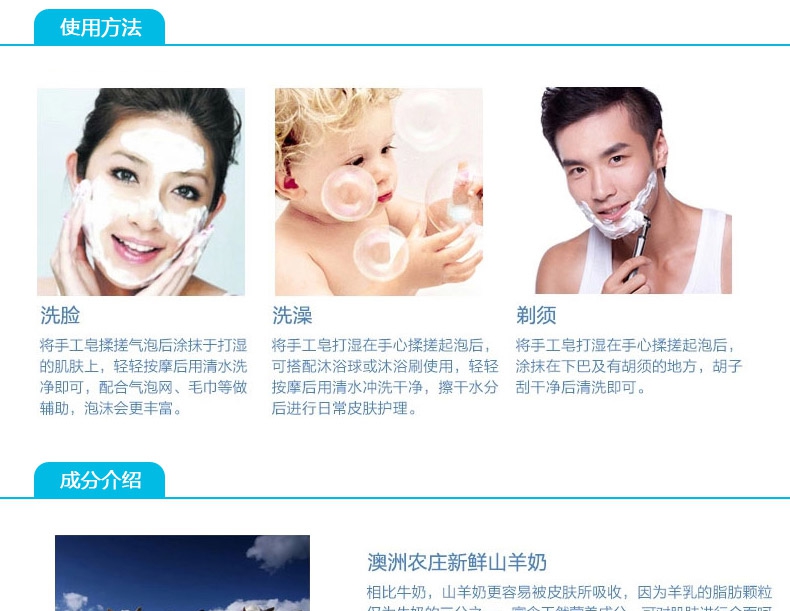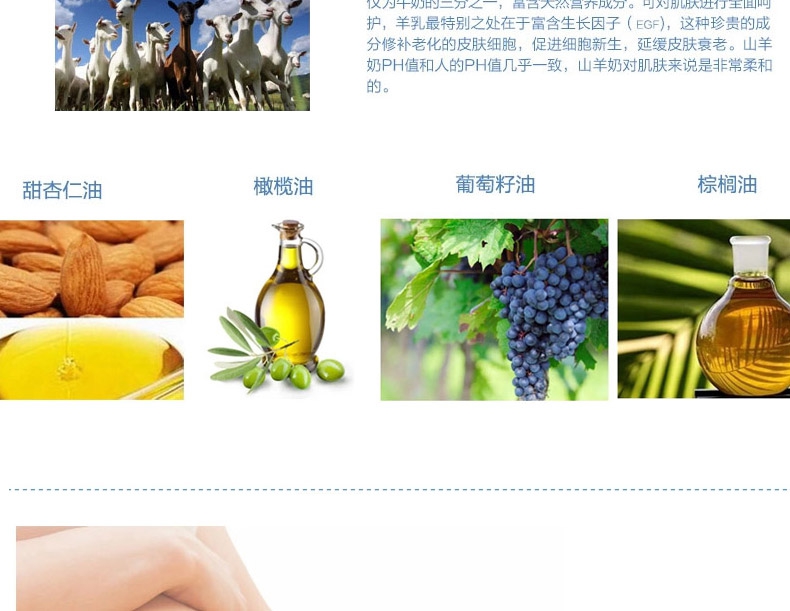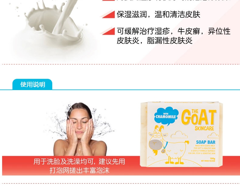 | 产品功效 | 保湿滋润,温和清洁皮肤。 同时可以缓解治疗湿疹,牛皮癣,异位性皮肤炎,脂漏性皮肤炎。 对婴儿湿疹有很好的清洁治疗效果。添加的柠檬桃金娘成分让你的肌肤留有柠檬的清香,与羊奶中含有的氨基酸结合有效去除死皮使其剥落。 |