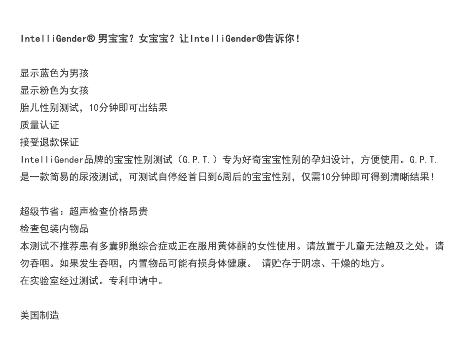 【产品内容】测试杯主体一瓶、注射器一支、英文说明书一份。孕期6周后可以预测胎儿性别,准确率为90%。