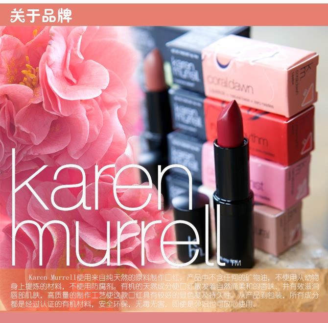 karen Murrell使用来自纯天然的原料制作这款口红,产品中不含任何的矿物油,不使用从动物身上提炼的材料,不使用防腐剂。有机的天然成分使口红散发着自然而柔和的香味,并有效滋润唇部肌肤,高质量的制作工艺使这款口红具有较好的显色度及持久性。