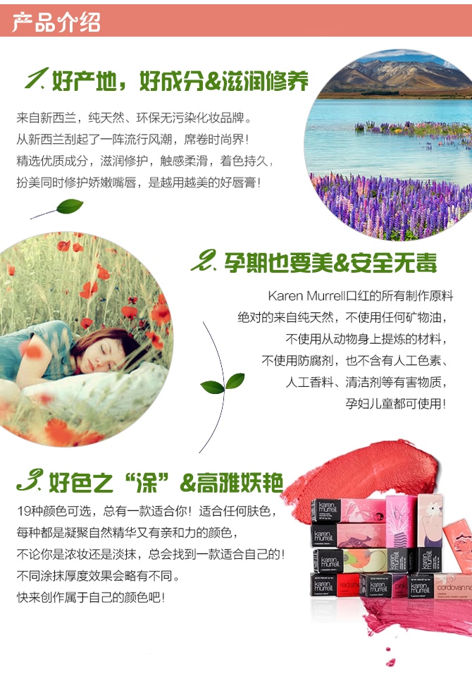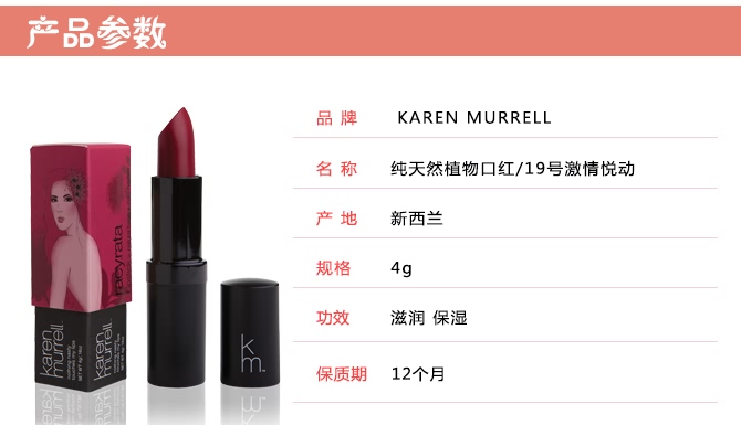 karen Murrell使用来自纯天然的原料制作这款口红,产品中不含任何的矿物油,不使用从动物身上提炼的材料,不使用防腐剂。有机的天然成分使口红散发着自然而柔和的香味,并有效滋润唇部肌肤,高质量的制作工艺使这款口红具有较好的显色度及持久性。