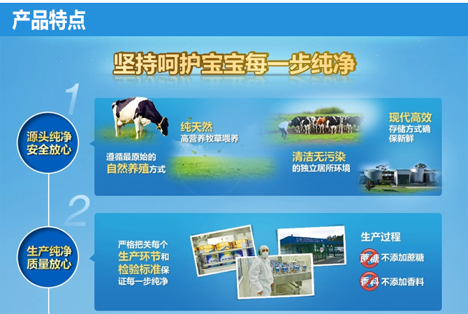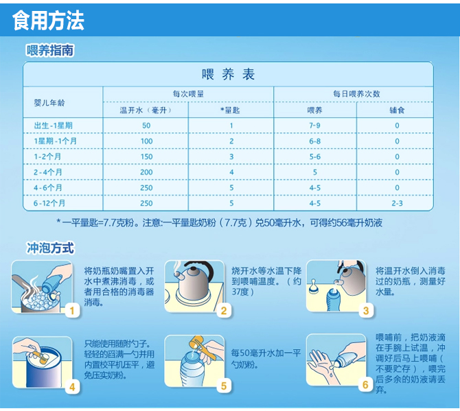 | 特别说明 | 切忌使用微波炉加热。 开封后的奶粉一定要保证密封,存放在干燥阴凉处。 启封后的奶粉请在4周内用完,切记不要将喝剩的冲调好的奶粉留到下次饮用 |