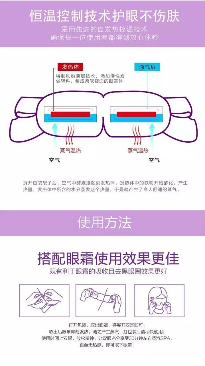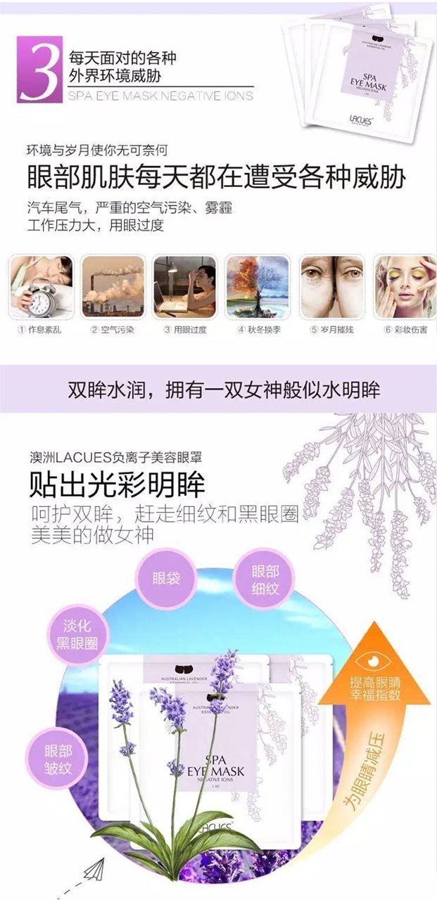LACUES尤加利护眼蒸汽眼罩内含尤加利精油以及活性备长炭等天然萃取成分,经蒸汽自发热,可持续热敷眼部,为眼睛彻底减压。在尤加利精油负离子状态的作用下,LACUES尤加利护眼蒸汽眼罩可深透润养眼部,畅通毛孔,消除暗疮,去黄美白,莹亮眼肌,令肌肤纹理细腻,柔嫩平滑,不仅双眸顾盼生辉,眼周肌肤也更年轻健康。