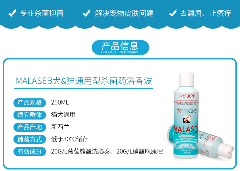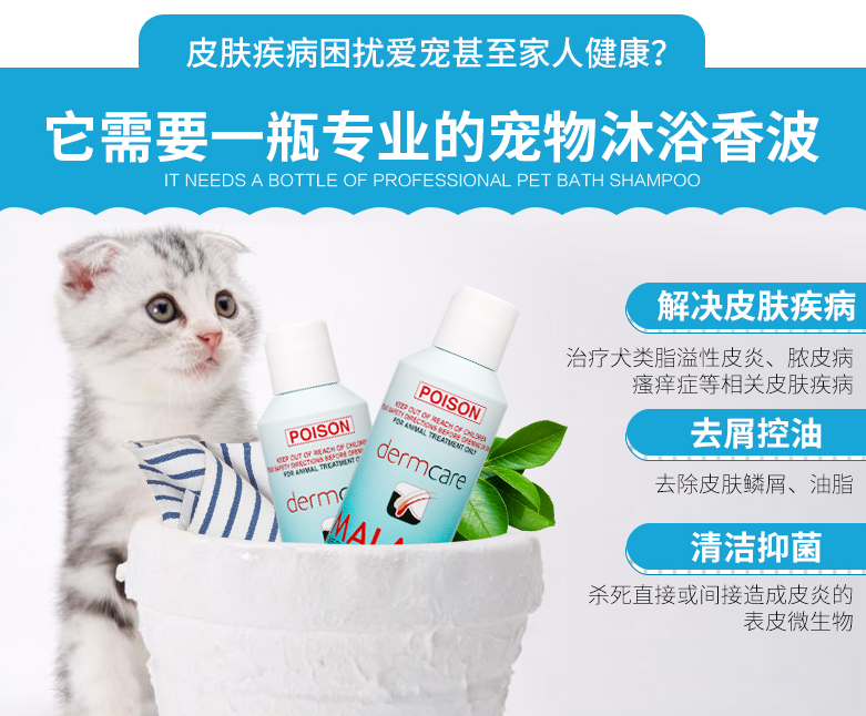 帮助治疗犬猫皮脂漏的发炎反应、细菌性皮肤炎及皮肤霉菌的感染(特别是皮癣菌症)。