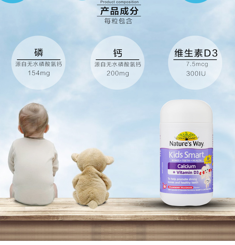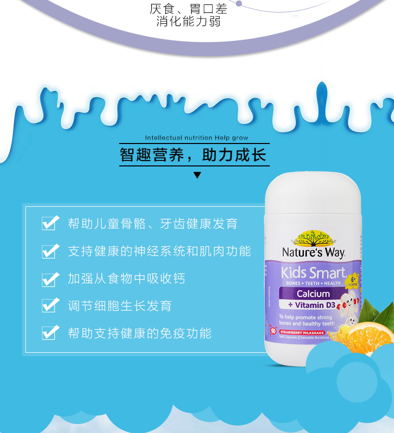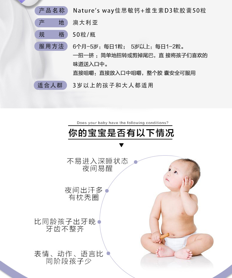【运输途中高温天气,胶囊类产品有融化风险,建议发EWE,如遇融化,签收72小时内提供破损物品与外包装合照(需清晰识别面单),可向EWE申请售后理赔,我司不参与理赔】本产品可以补充孩子生长发育所需维生素D3和钙,有效促进孩子骨骼生长和牙齿发育,帮助提高免疫力,保护孩子的健康发育。