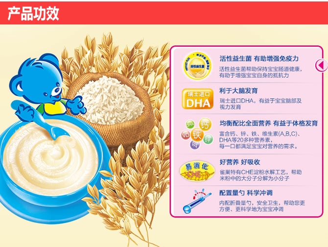 婴儿配方米粉米粉主要配料:燕麦,玉米淀粉,西梅片,铁,维生素,益生菌, 无人工香料 不添加颜色 没有防腐剂 不添加糖,特别添加了活性益生菌,能促进肠道益菌菌丛生长,抑制害菌滋生,维持肠道健康,帮助消化和吸收,吃了消化好,且不易便秘,促进宝宝消化,增强食欲,增加宝宝抵抗力。