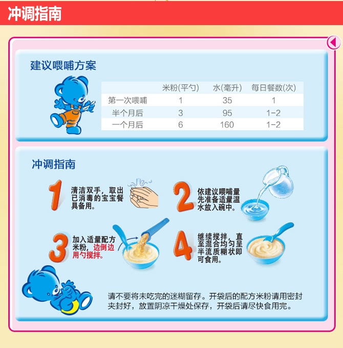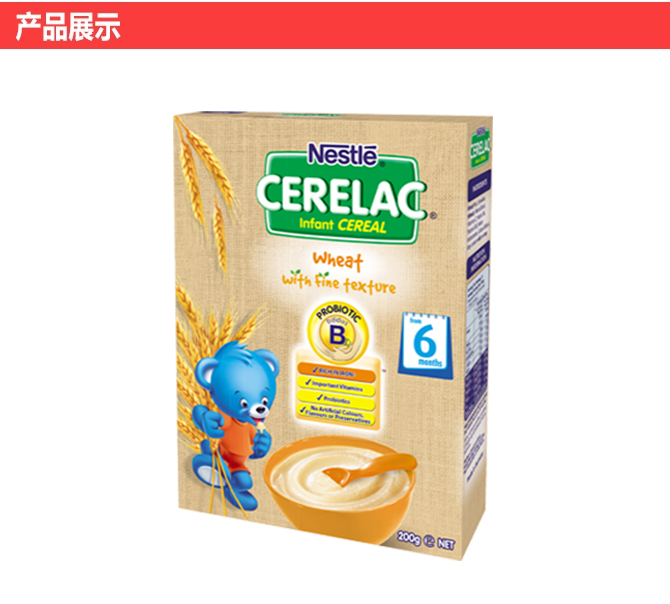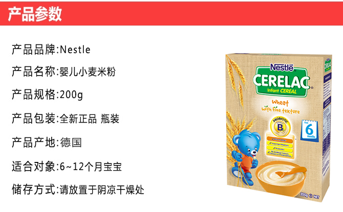 Nestle 雀巢 婴幼儿配方小麦米粉 (6个月以上),富含婴儿益生菌,高铁有助宝宝生长发育并消化。她采用独特技术预消化工艺生产,将淀粉大分子分解成为小分子,就象预先帮宝宝消化了一次,更容易被宝宝消化吸收雀巢婴儿米粉提供宝宝 全面均衡的营养,给宝宝一个良好开端,帮助宝宝从纯乳类的液体饮食顺利地过渡到半固体及固体食物。