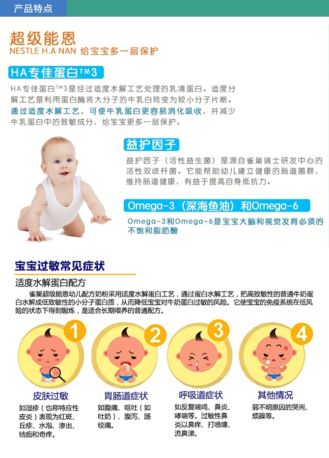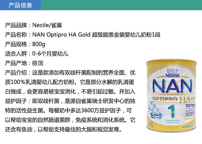 Nestle NAN HA 雀巢超级能恩金盾奶粉1段(0-6个月)口感清淡,奶味香醇,宝宝爱喝且不易上火。是专为0-6个月婴儿的营养需要而特殊调配的适度水解蛋白配方奶粉,富含乳清蛋白,维生素和矿物质,均衡比例的DHA和ARA并添加BL益生菌。全面为宝宝建立自身免疫系统提供帮助,让宝宝拥有更强免疫力,促进宝宝大脑、视力、消化系统和神经系统的健康生长发育,让宝宝拥有好眼力,好脑袋,好身体。