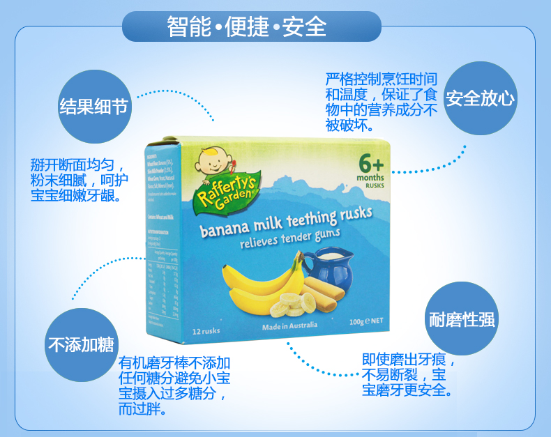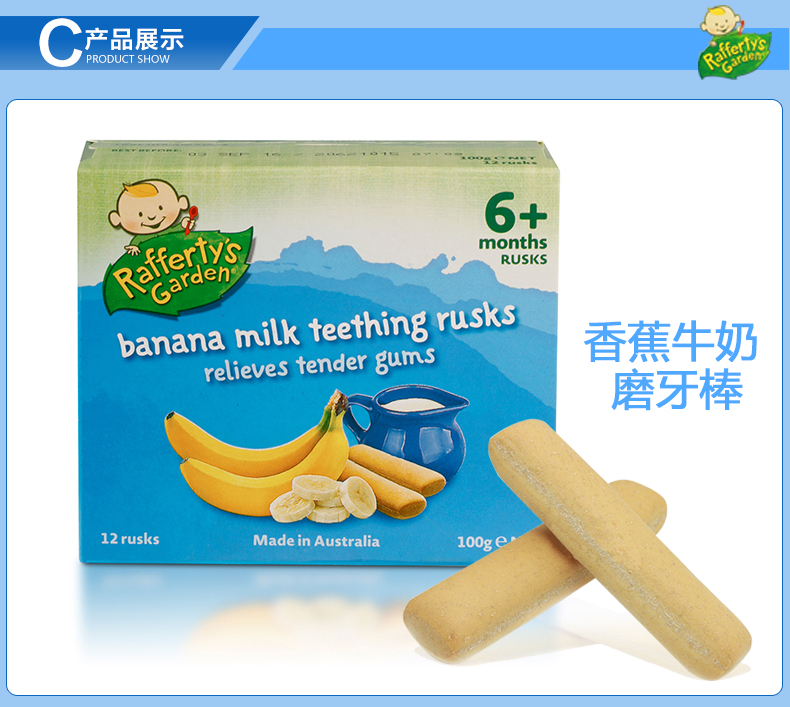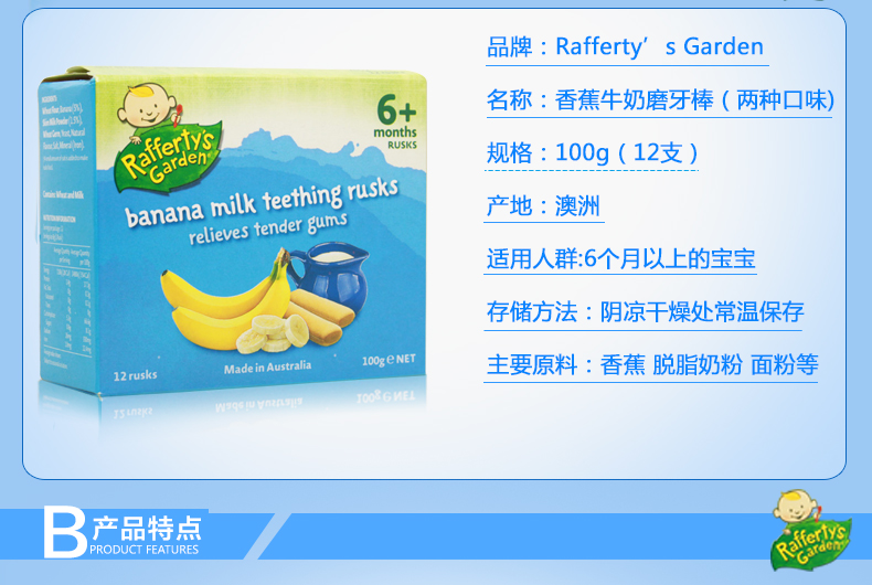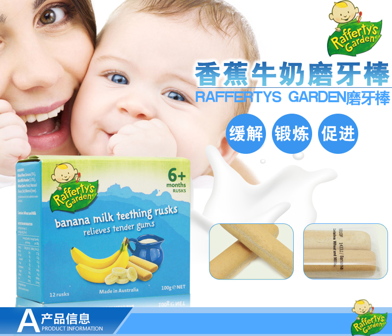 Rafferty's Garden香蕉牛奶磨牙棒是专为磨牙期的宝宝研制,原料经特殊处理,具有适中的硬度,可帮助宝宝减轻萌牙的不适,充分锻炼宝宝的咀嚼能力并促进牙弓和颌骨的发育。香蕉牛奶味口感很好,更能吸引宝宝,让宝宝啃得更香!!