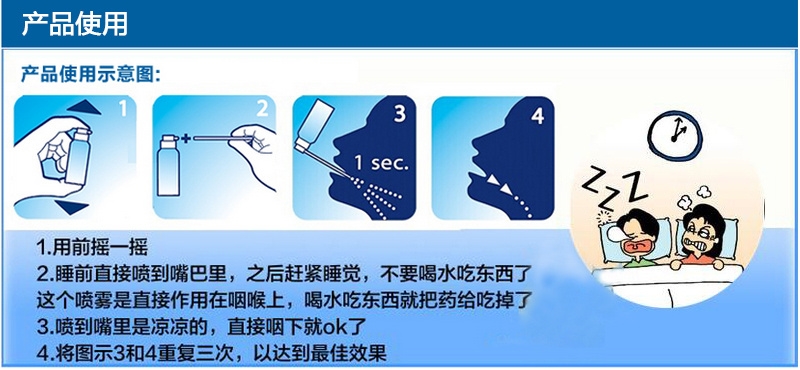 | 特别说明 | 1、用前摇一摇 2、然后直接喷到嘴巴里(3-4次),之后就赶紧睡觉吧,不要喝水吃东西了,如果你实在是要喝水吃东西的话,那就请喝完水,吃好东西再喷一次!不然不管用!因为这个喷雾是直接作用在咽喉上的,你喝水吃东西就把药给吃掉了。 3、喷到嘴里是凉凉的,奶黄色,奶油状的物体,直接咽下即可。 |