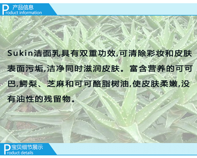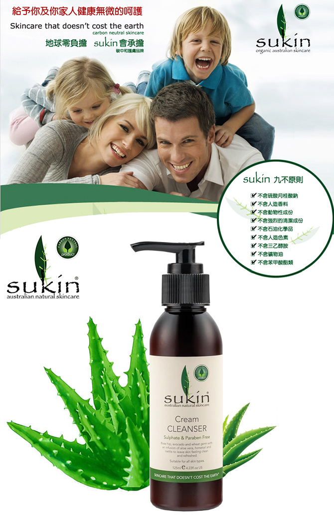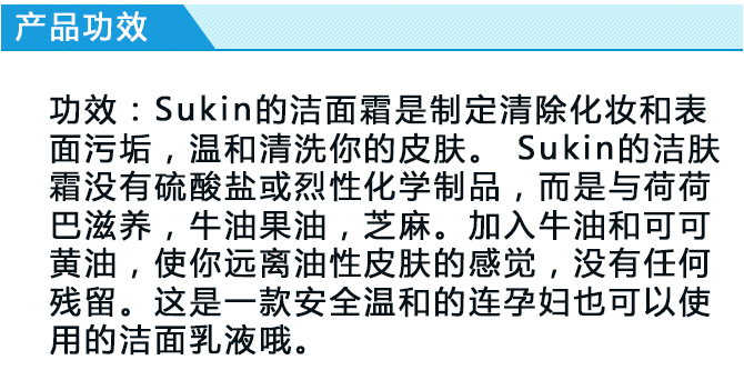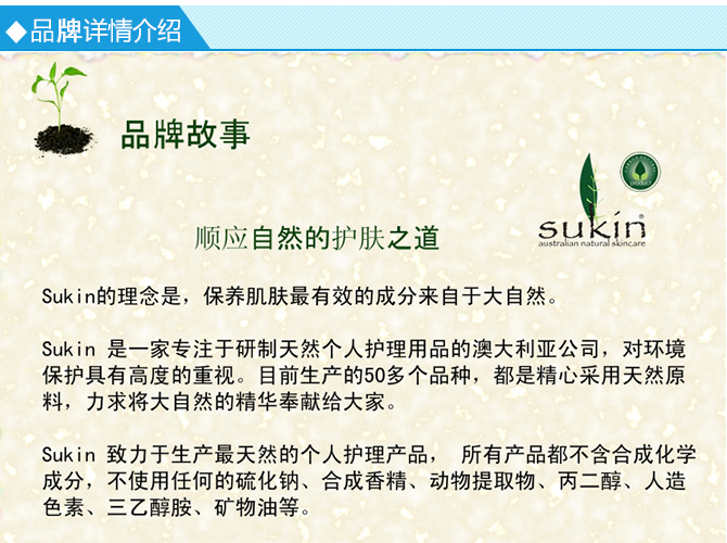 Sukin 苏芊 天然有机保湿洁面乳洗面奶配方温和,质地轻柔,洁面感觉舒适,不会令肌肤干燥。蕴含芦荟、牛蒡、马尾、荨麻、玫瑰果油、鳄梨油和小麦胚芽油等天然成分,能有效去除彩妆和面上的污垢、油垢,帮助改善肌肤质地,使肌肤清爽透明有弹性。在彻底清洁肌肤的同时带来深层持久保湿的效果;有助于修复肌肤的损伤,促进肌肤自身的修复;可使面部肌肤水嫩光滑,焕发年轻光彩。