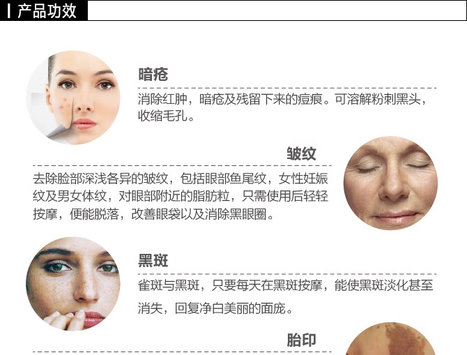 | 产品功效 | 消除疤痕和麻点;防止皮肤老化;减轻色素沉着;护发养发;用于皮肤的日常护理 |