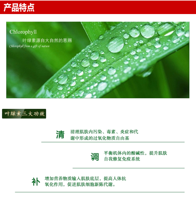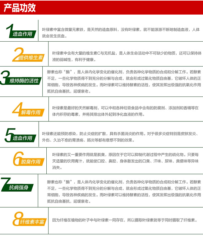 | 特别说明 | 一天3粒,可以一次三粒饭前饭后服用都可;不适合正在服用华法令等药物的一起吃,叶绿素含高含量的维他命K。 |