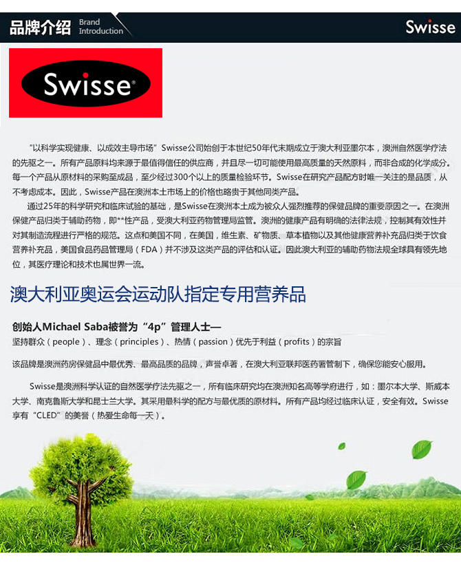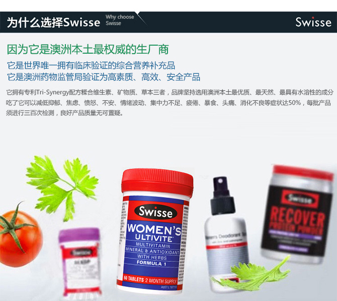 “以科学实现健康,以成效主导市场”Swisse公司始创于本世纪50年代末成立于澳大利亚墨尔本,澳洲自然医学疗法的先驱之一。所有产品原料均来源于最值得信任的供应商,并且尽一切可能使用最高质量的天然原料,而非合成的化学成分。每一个产品从原料的采购至成品,至少经过300个以上的质量检验环节。Swisse在研究产品配方时唯一关注的是品质,从不考虑成本。因此,Swisse产品在澳洲本土市场上的价格也略贵于其他同类产品。