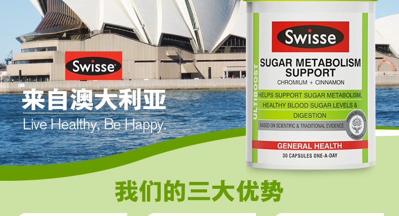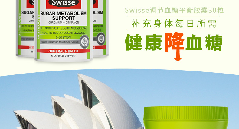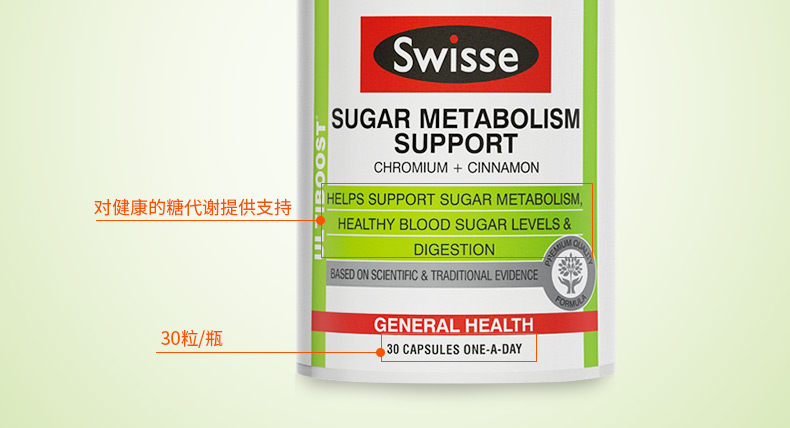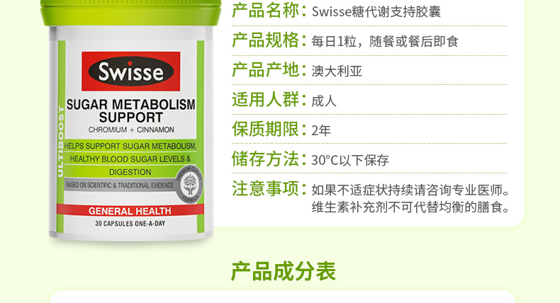 Swisse 血糖平衡胶囊含有能量生成所需的铬、维生素、镁、维生素B6和维生素B12的复合配方,有助于替换因饮食或运动习惯改变引起的血糖平衡所需要的营养缺失,支持和调节来自食物新陈代谢的能量生成,并且支持运动中或运动后的新陈代谢。适合所有男性、女性、及老年人,特别是血糖高的人群。