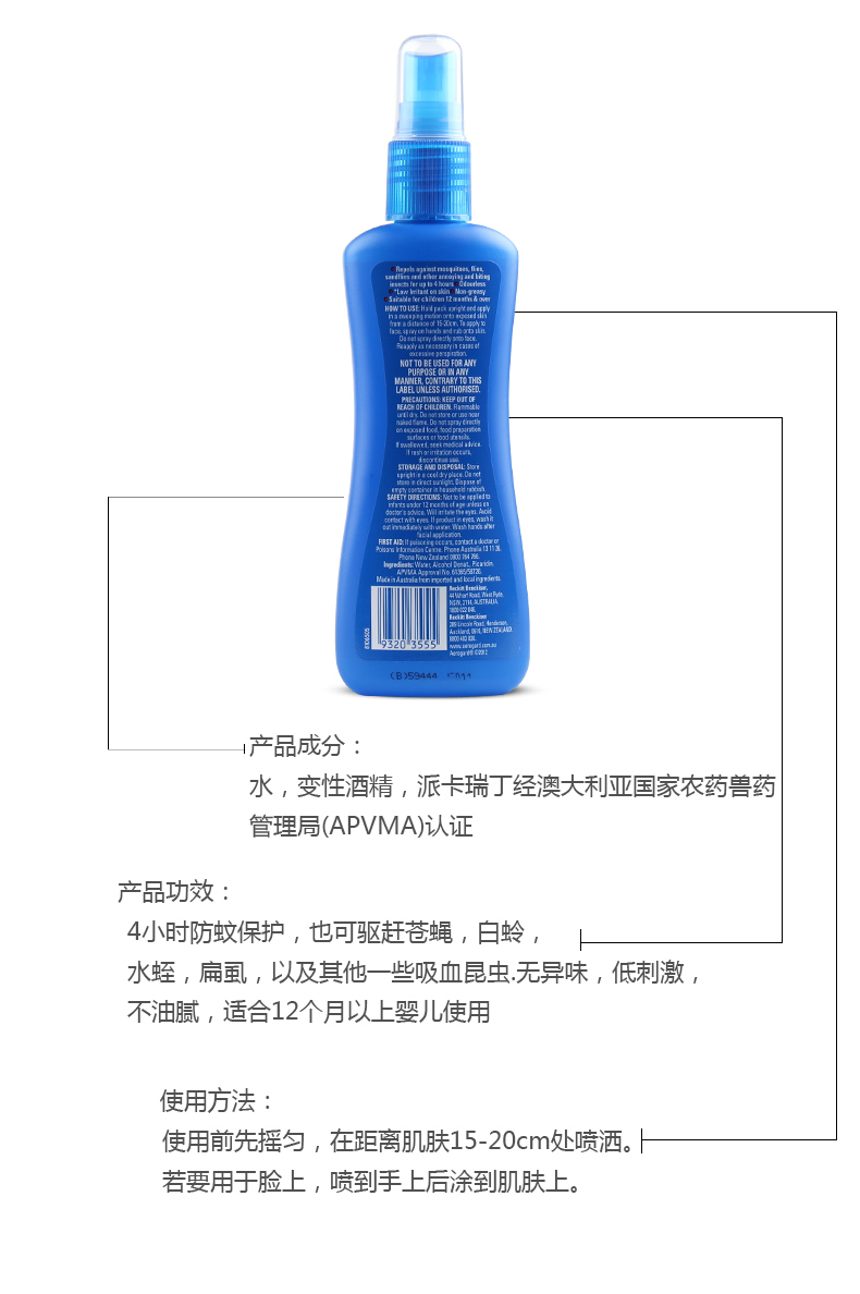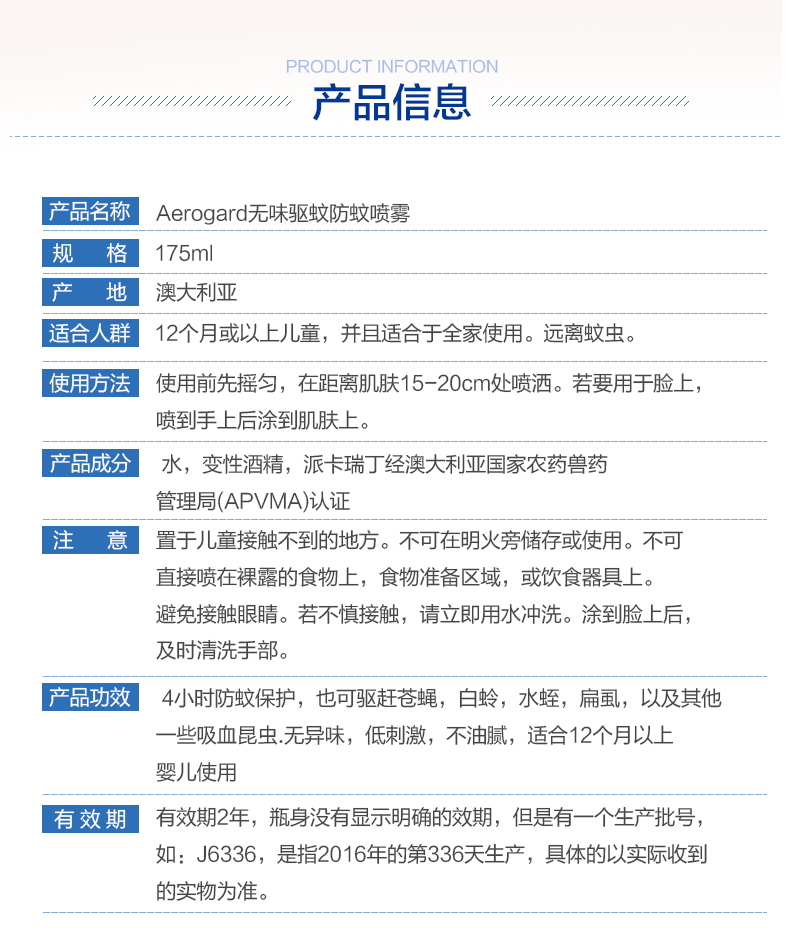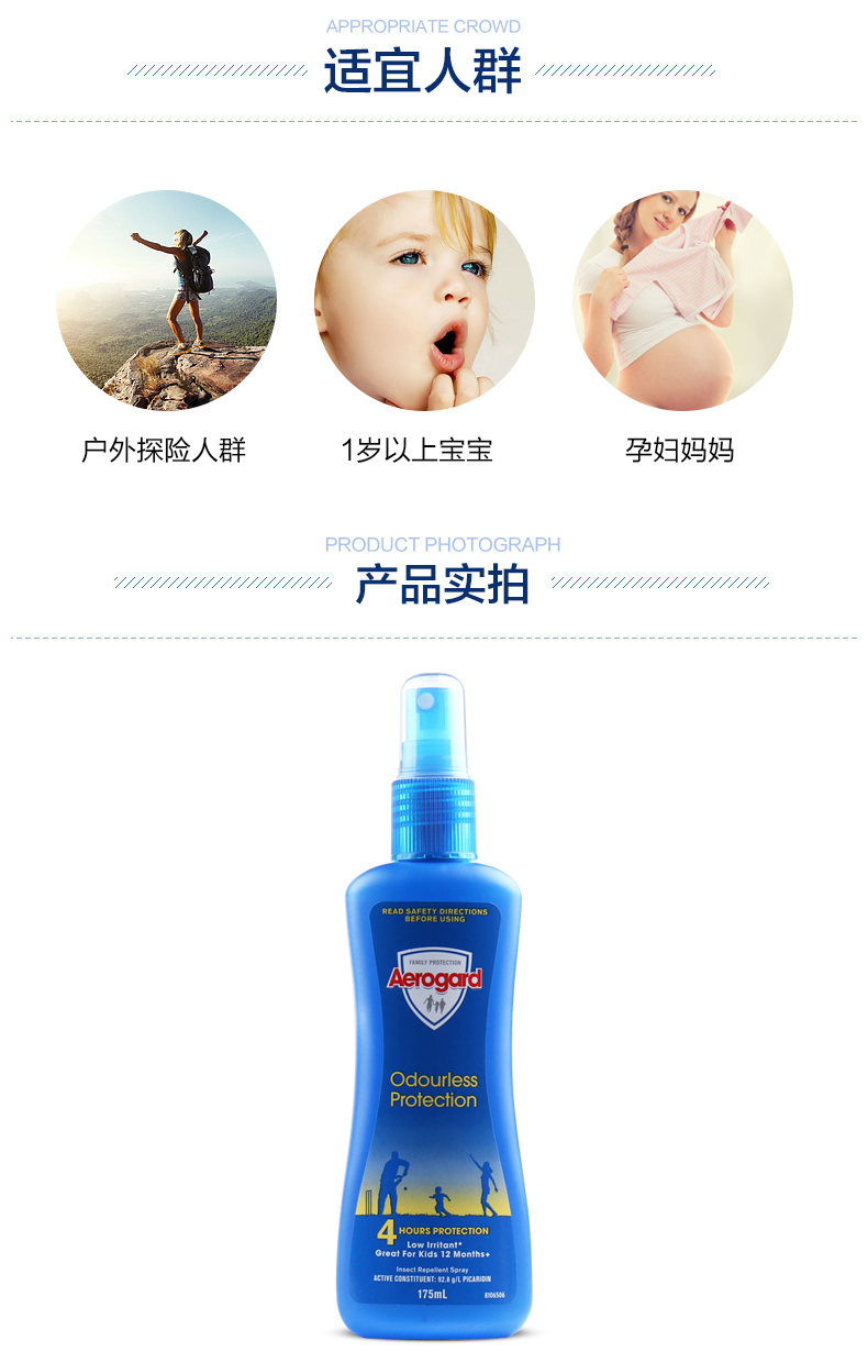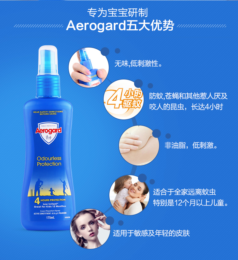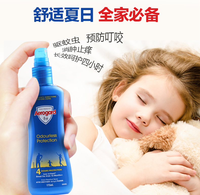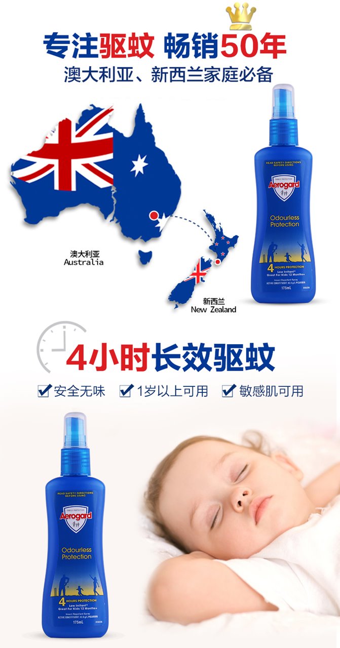 Aerogard系列驱虫产品属于全球知名的上市公司利洁时(Reckitt Benckiser)集团下属品牌,和知名的防虫品牌Mortein同属一个系列。此品牌创始于19世纪70年代,澳洲驱蚊领导地位超过一百多年。本品含派卡瑞丁成分,无色无味,6 小时长效,是您全家假日出游的上佳选择。