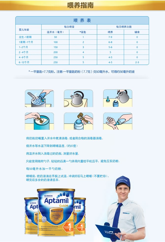 | 特别说明 | 建议水温37-40左右,可用温奶器提前温着,一定要先放水再放奶粉,立即摇匀。可一定程度上减少沉淀。 |