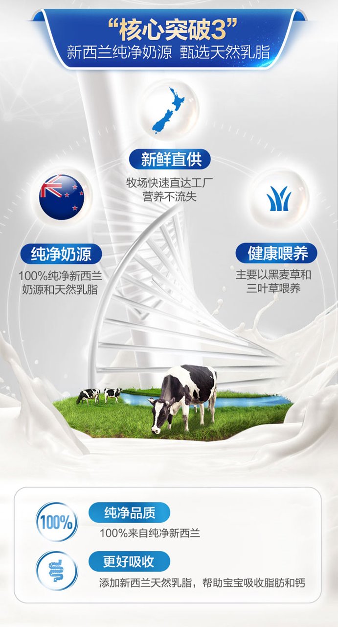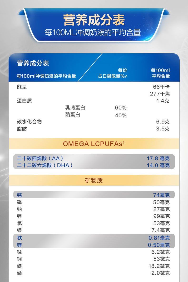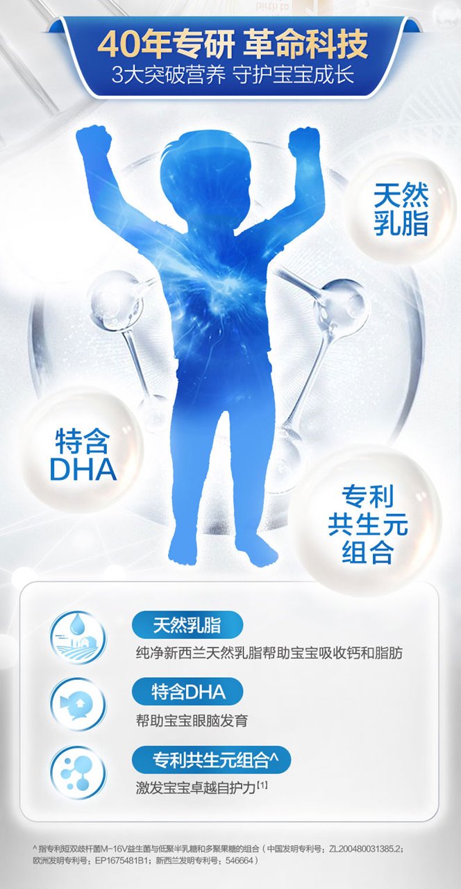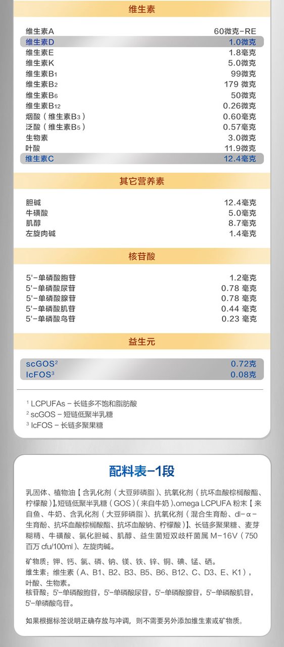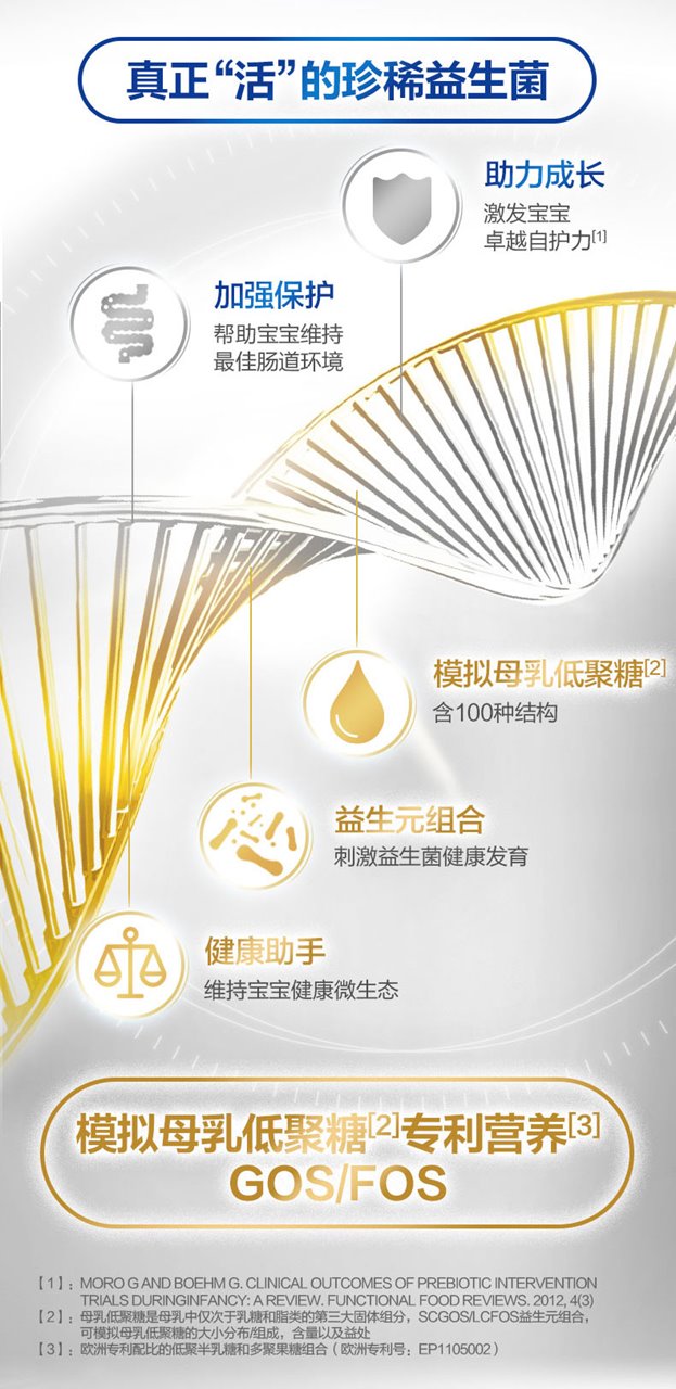 1.Omega3和DHA促进婴幼儿脑部发育。2.含有大量人体必需矿物质和维生素,帮助提升免疫力。3.富含丰富维生素C,帮助铁元素的吸收,同时提供宝宝成长所需的钙质和蛋白质。5.活性益生菌对于宝宝肠胃有更好的改善调理作用,增强食欲,促进营养成分消化吸收,防止便秘。