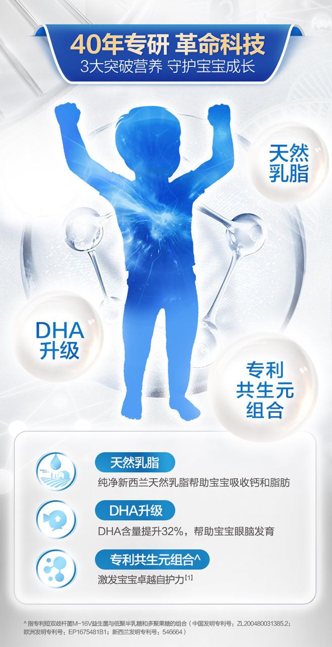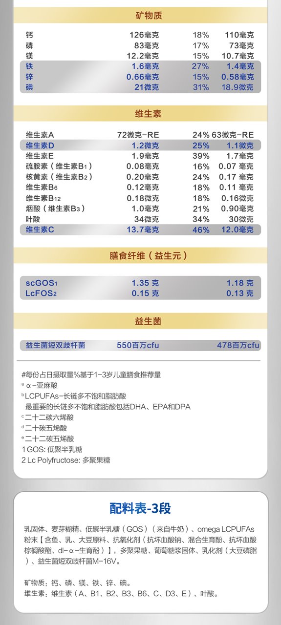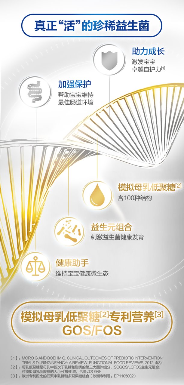 1.Omega3和DHA促进婴幼儿脑部发育。2.含有大量人体必需矿物质和维生素,帮助提升免疫力。3.富含丰富维生素C,帮助铁元素的吸收,同时提供宝宝成长所需的钙质和蛋白质。5.活性益生菌对于宝宝肠胃有更好的改善调理作用,增强食欲,促进营养成分消化吸收,防止便秘。