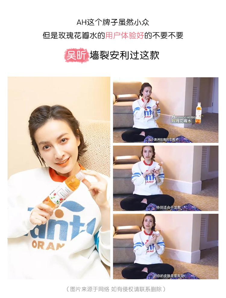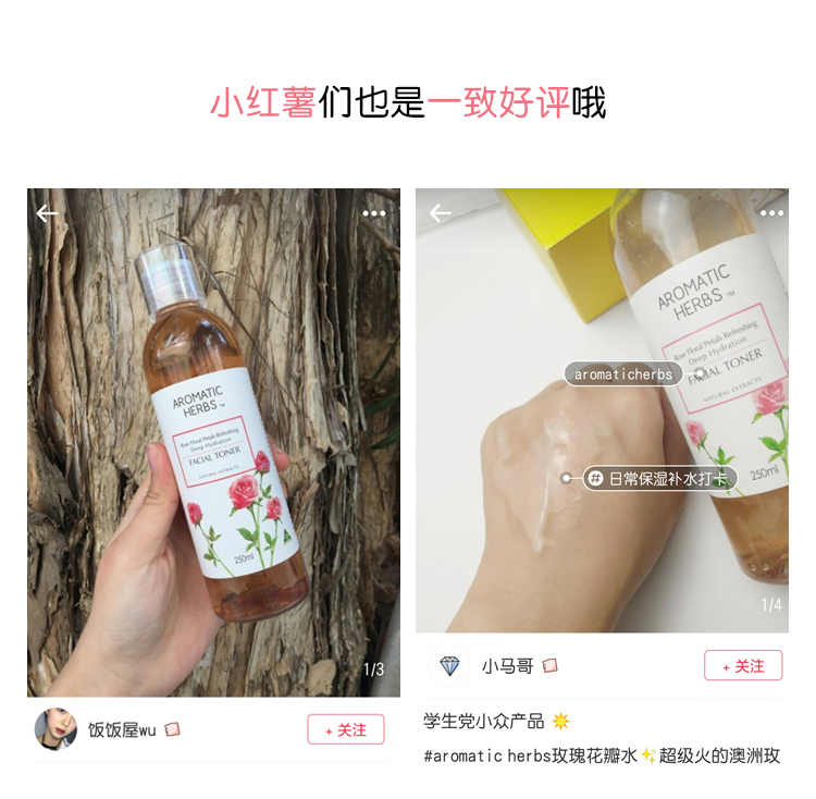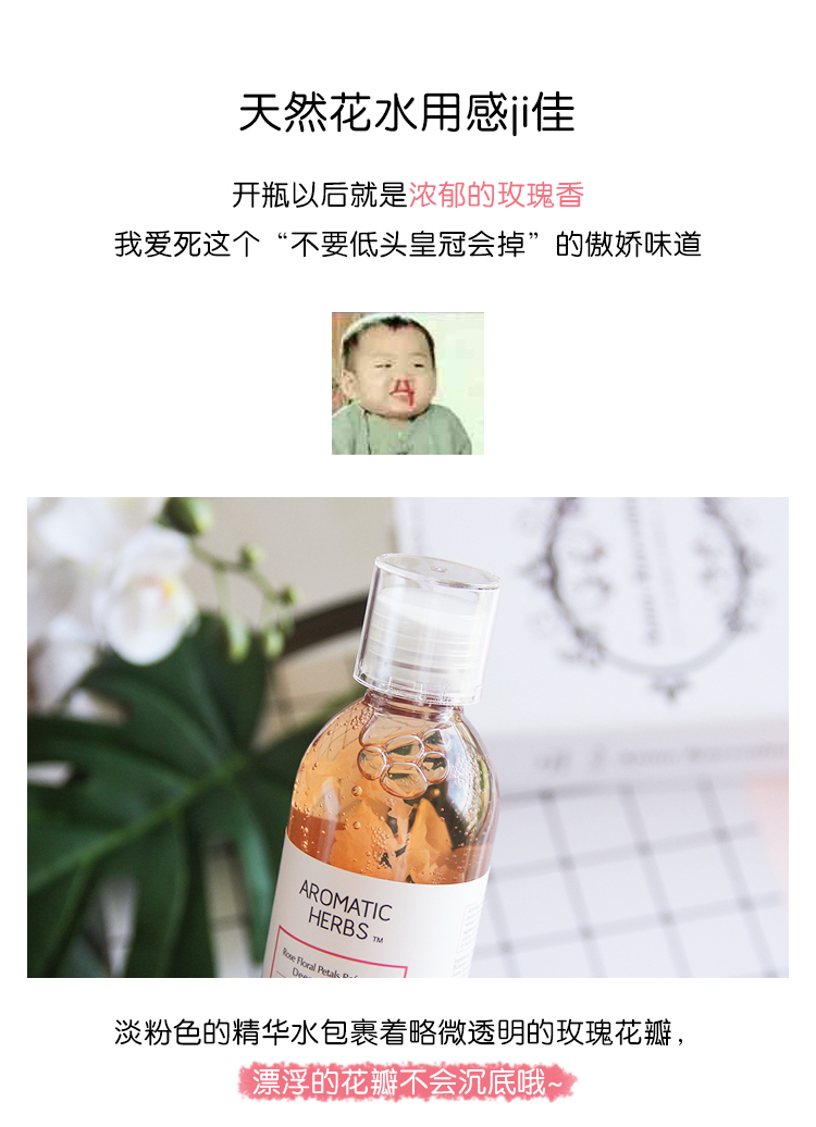 Aromatic Herbs玫瑰花瓣精华水纯植物萃取,天然保湿、滋养抗老、促进代谢、恢复皮肤弹性、紧致毛孔,这款水里注入了有机真花瓣,澄黄的液体特别透,所以里面的花瓣能很清楚的看到,给人很直观的玫瑰水的感觉,很有料又超好看!结合玻尿酸因子,为肌肤锁住水份保湿,使肌肤保湿丰润亮泽