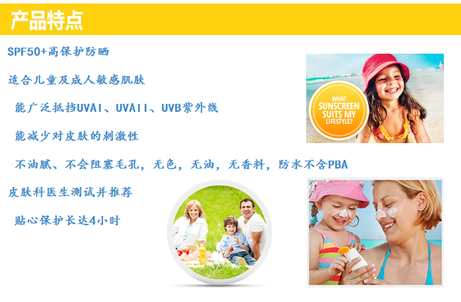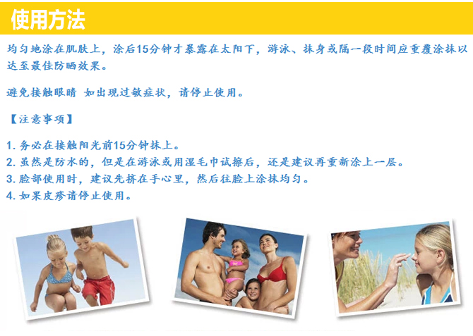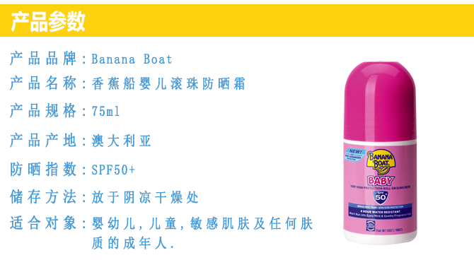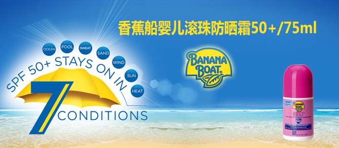 Banana Boat是最畅销的防晒品牌之一,隶属Playtex公司,是专业的防晒品牌。该品牌占全球防晒品5%的市场份额,Banana Boat去年在美国的销售额排名第二,达到8940万美元。由皮肤科医生测试,独家Powder-Dri技术,让涂上去乳状的防晒品魔术般地干爽如粉状,告别油腻,干爽透气。更有尖端的AvoTriplex光稳定保护技术,犹如一把保护伞,抵御紫外线对皮肤的伤害。