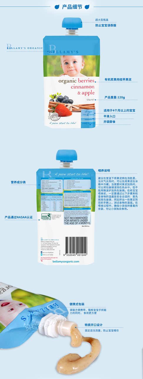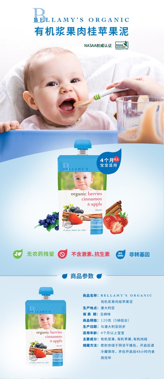 Bellamy's贝拉米婴儿有机辅食 浆果肉桂苹果泥粥120g