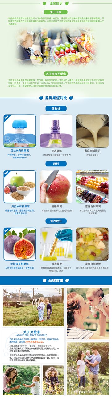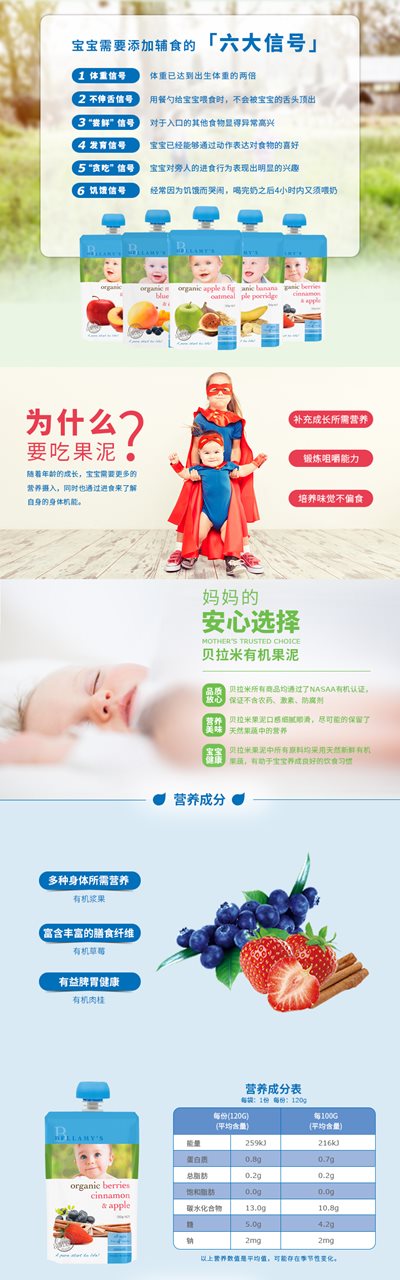 水果是宝宝身体健康和均衡饮食所必须的。贝拉米有机系列为新生婴儿到学龄前儿童提供全系列的有机食物。贝拉米的有机婴儿食物取自于当地农场最新鲜最美味的有机食材,做成了100%有机成分的健康食品。 100%有机谷物,添加铁元素,无糖,无添加剂,无色素, 无鸡蛋,无防腐剂。