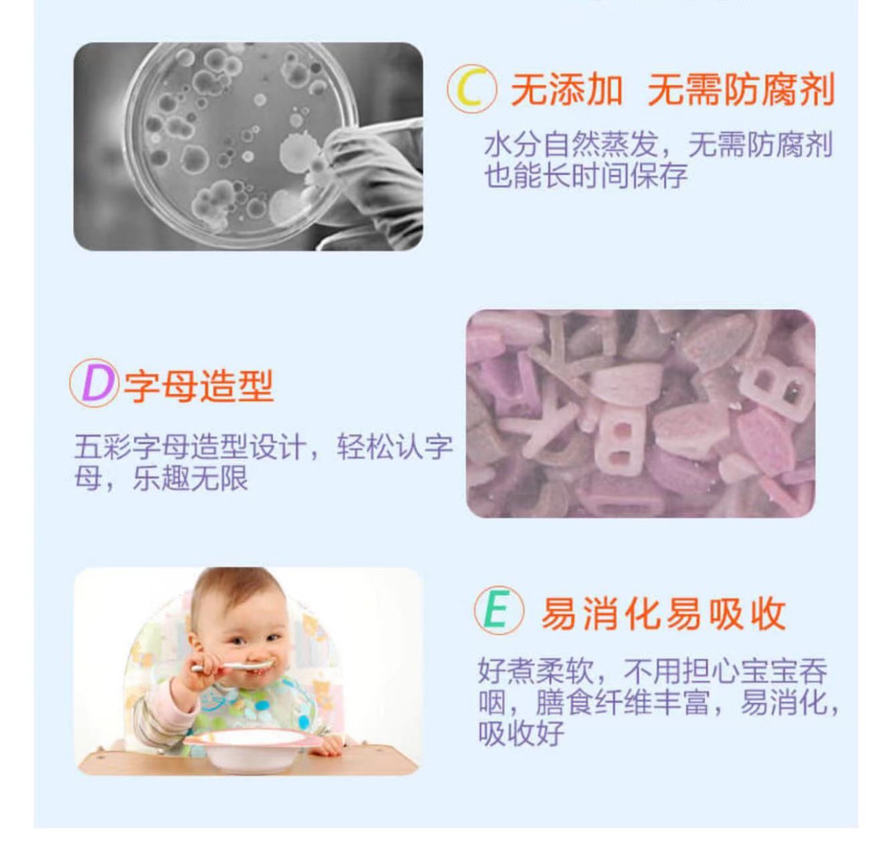 有机,无添加剂,无色素,无添加糖,无添加盐,丰富的蔬菜。各种蔬菜的颜色,和A-Z的字母形状能够帮助孩子分辨颜色和学习字母。