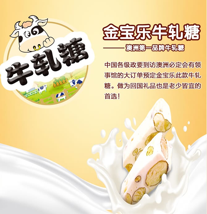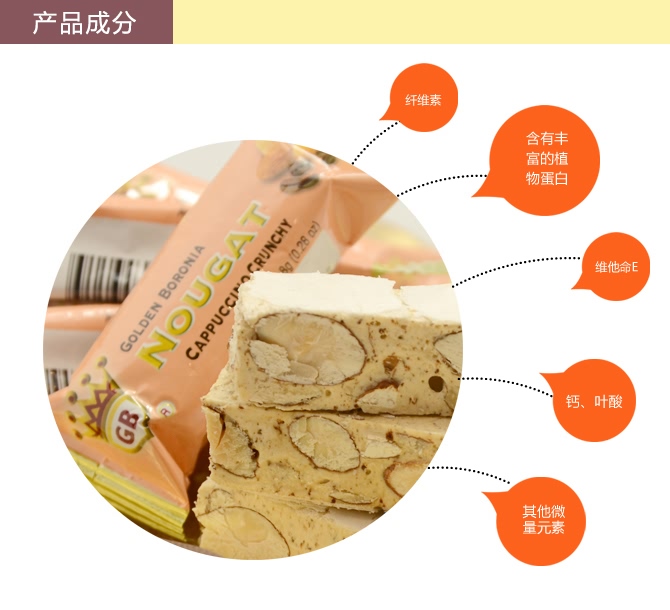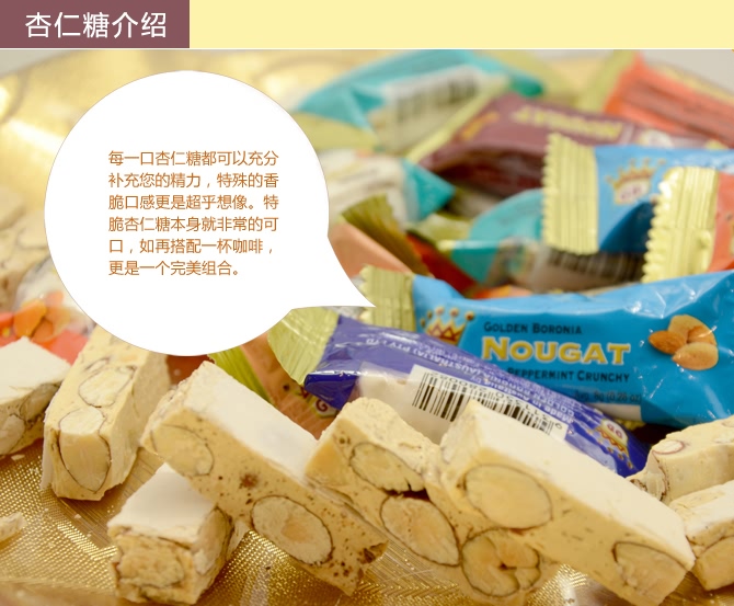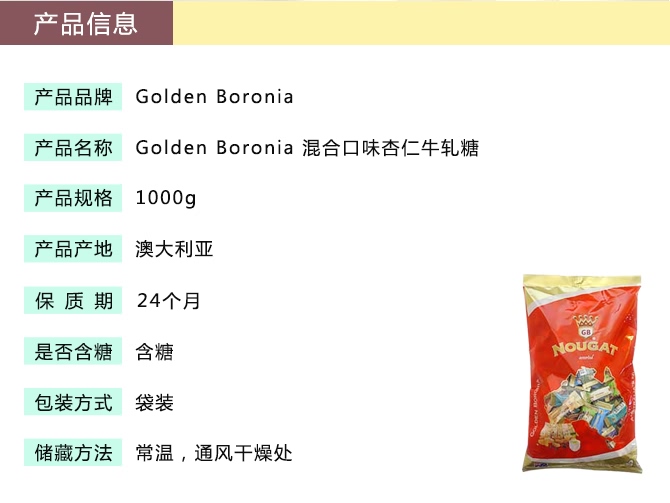 澳洲第一品牌,无人不知无人不晓 原装进口 Golden Boronia金宝乐杏仁糖 由烘焙杏仁(50%)、蜂蜜、葡萄糖浆、白砂糖、蛋清、水制成