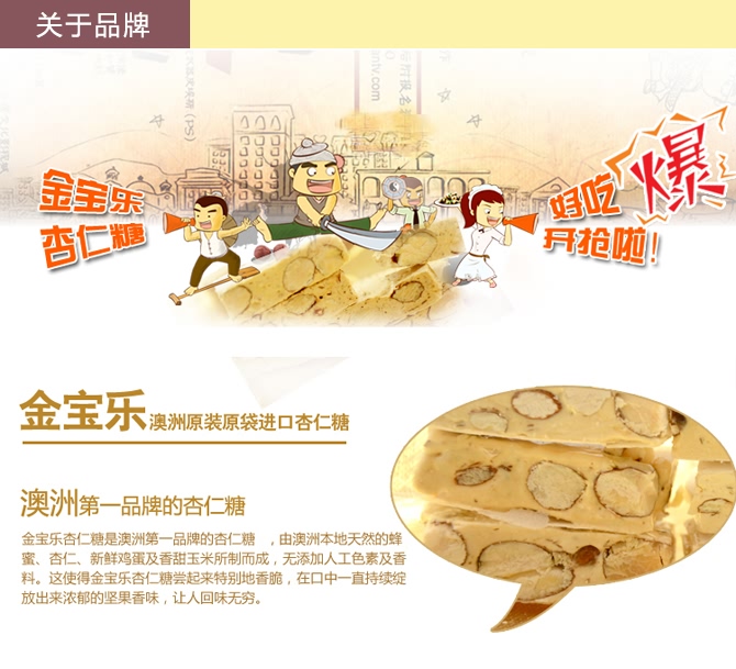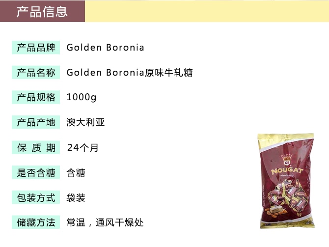 澳洲第一品牌,无人不知无人不晓 原装进口 Golden Boronia金宝乐杏仁糖 由烘焙杏仁(50%)、蜂蜜、葡萄糖浆、白砂糖、蛋清、水制成