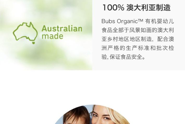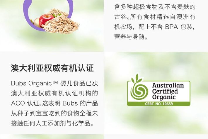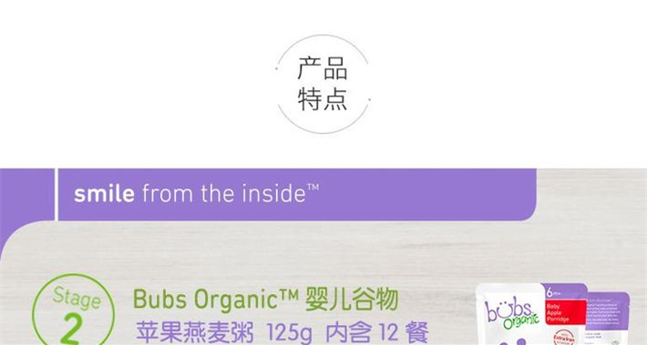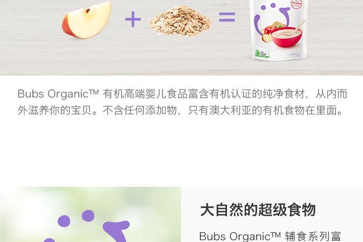 Bubs 贝儿 有机婴儿辅食 有机燕麦+苹果粥(6个月+)原料来自澳洲本土的农场,天然有机无添加,配料100%为纯蔬菜、水果、谷物及肉类,美味可口,营养均衡,口感细腻自然,宝宝爱吃好消化。不含任何的化学合成农药和肥料,不含转基因物质,保证宝宝营养安全,采用科学配方,为宝宝成长发育提供均衡的营养。