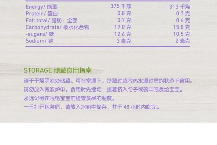 采用的是高品质有机食材,保留了食物的原汁原味,充满果蔬原有的美味与香甜~不含食盐或糖,不添加防腐剂或添加剂,呵护宝宝健康成长。