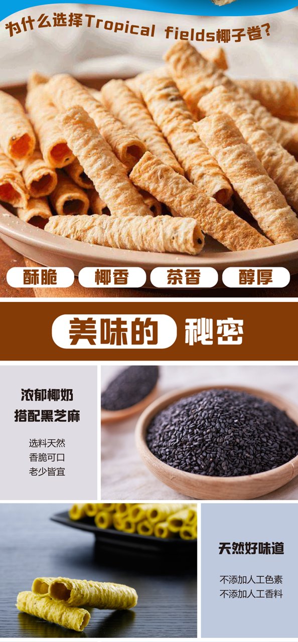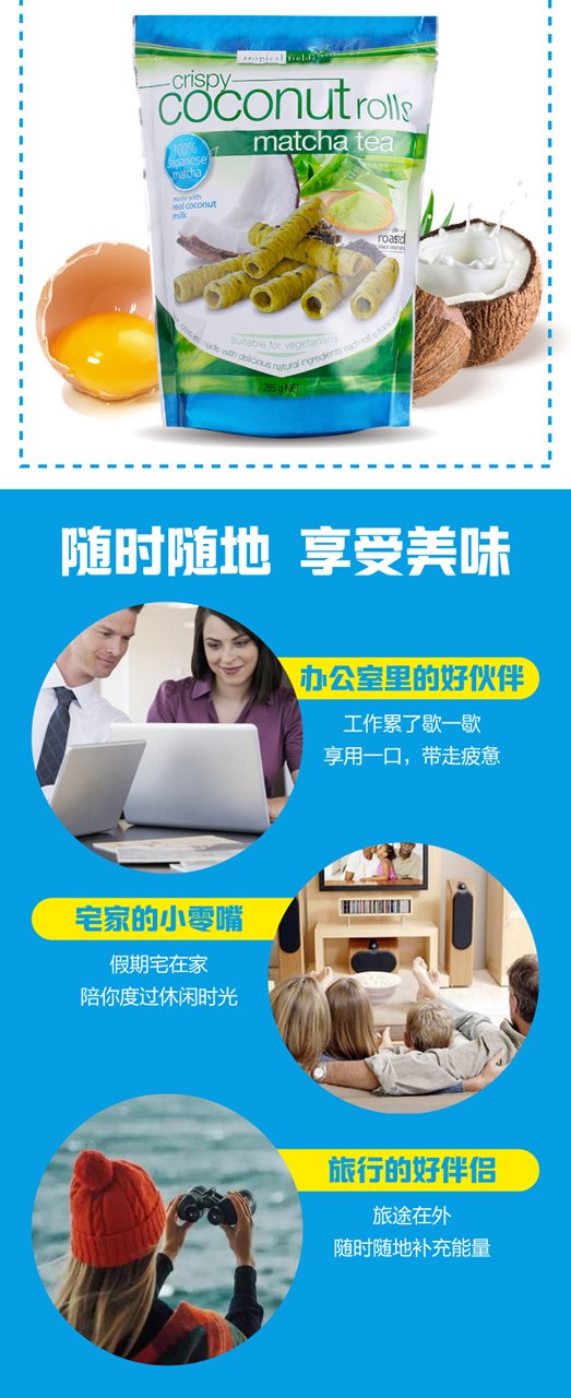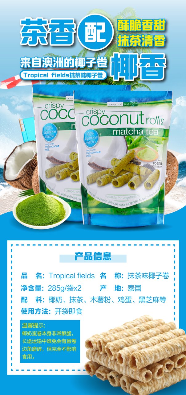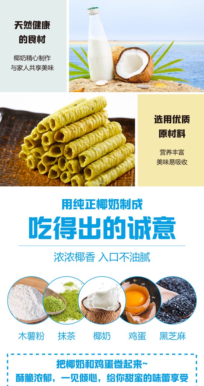 浓浓的椰子味和,抹茶味的天作之合,香脆的口感,非常适合吃货们, 是不能辜负的美食之一 不像普通的蛋卷那么甜 无法形容的好吃 蛋卷的详情请看图片,简易的包装,密实得得封口,易存易放