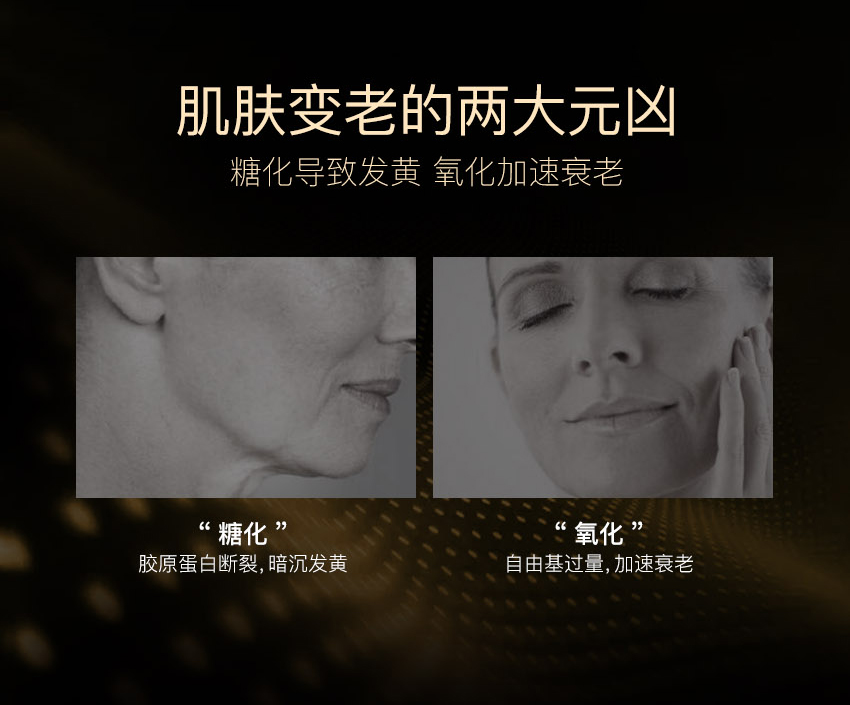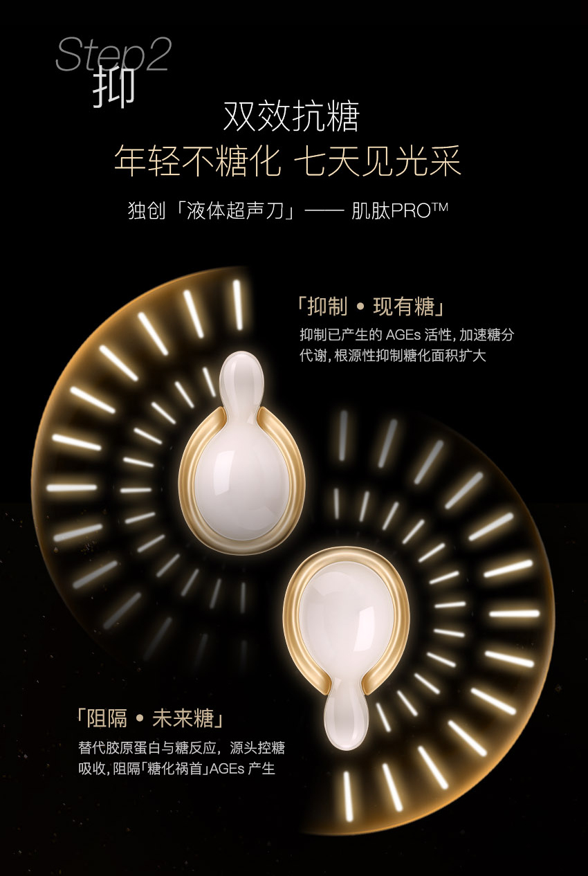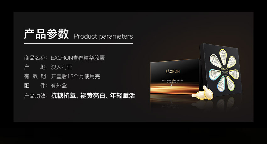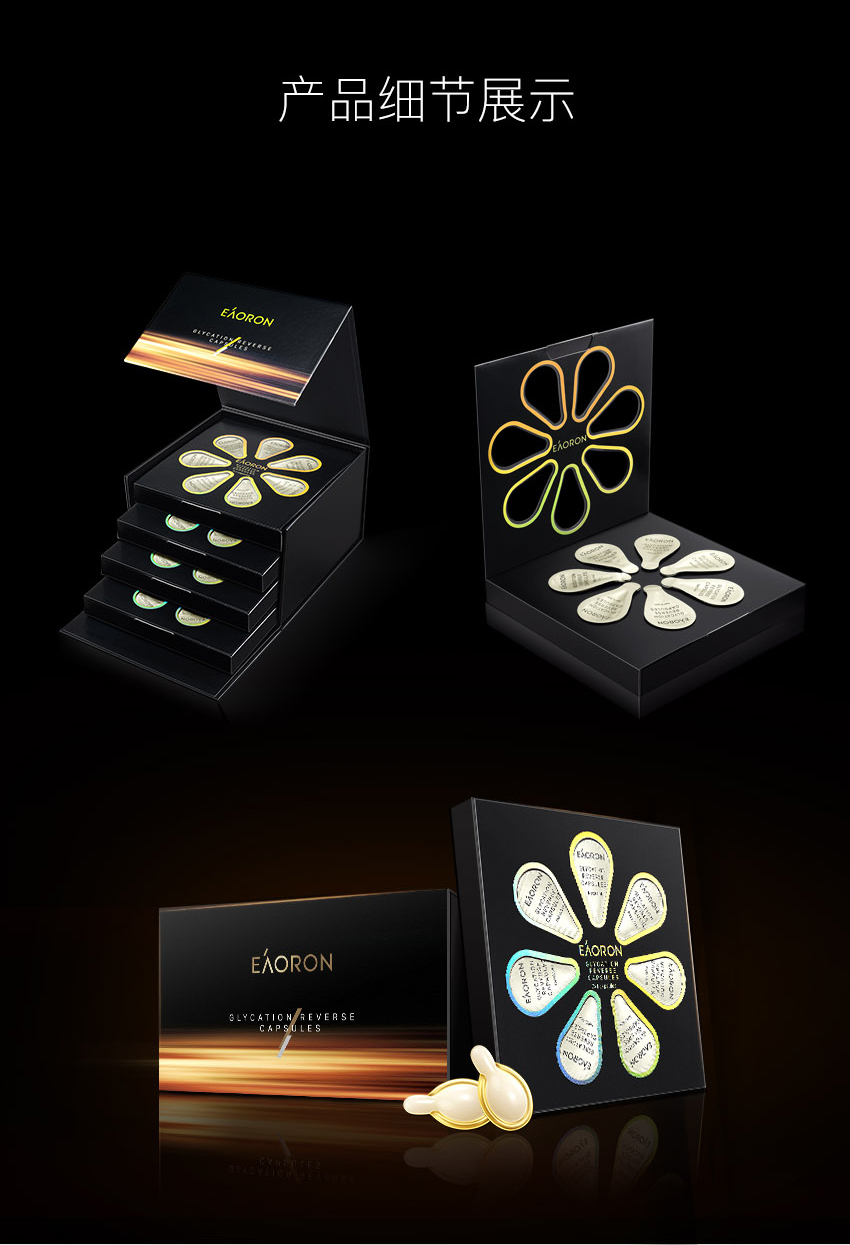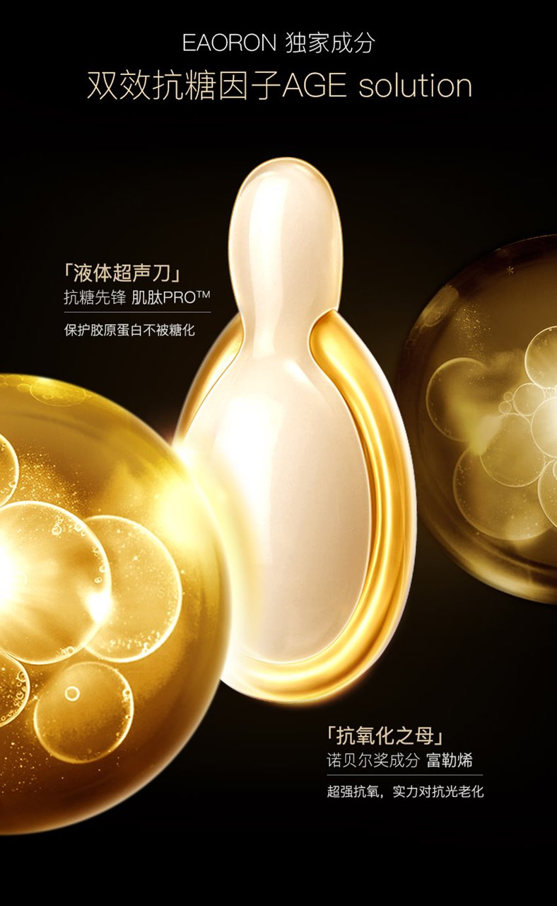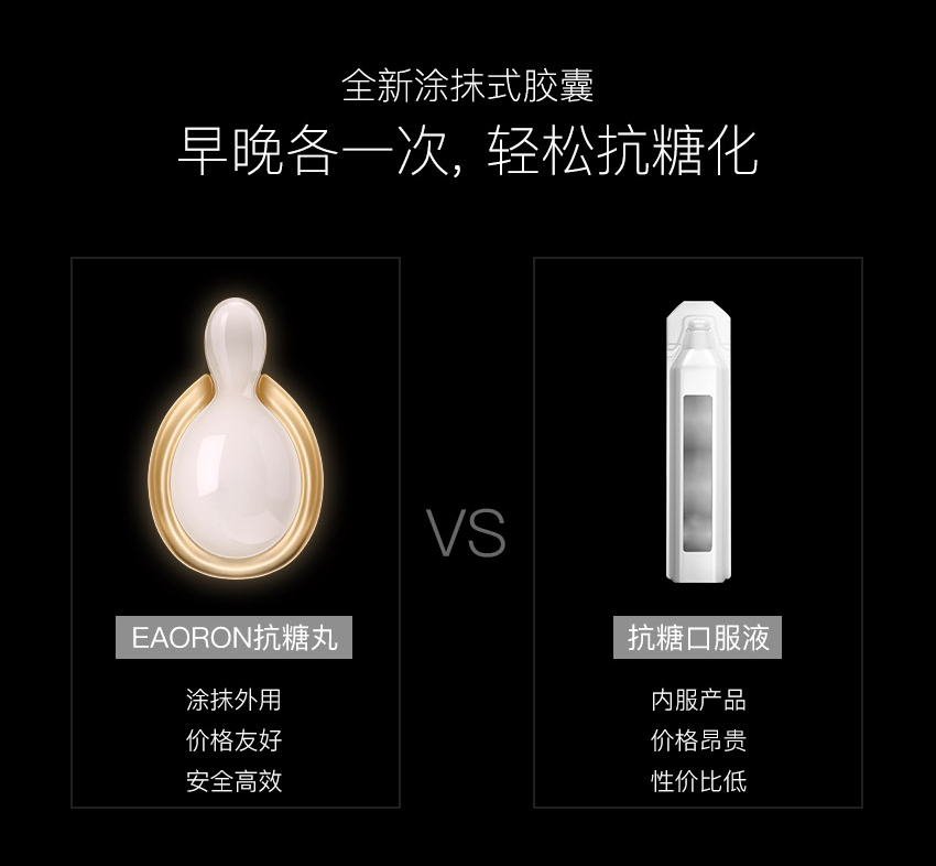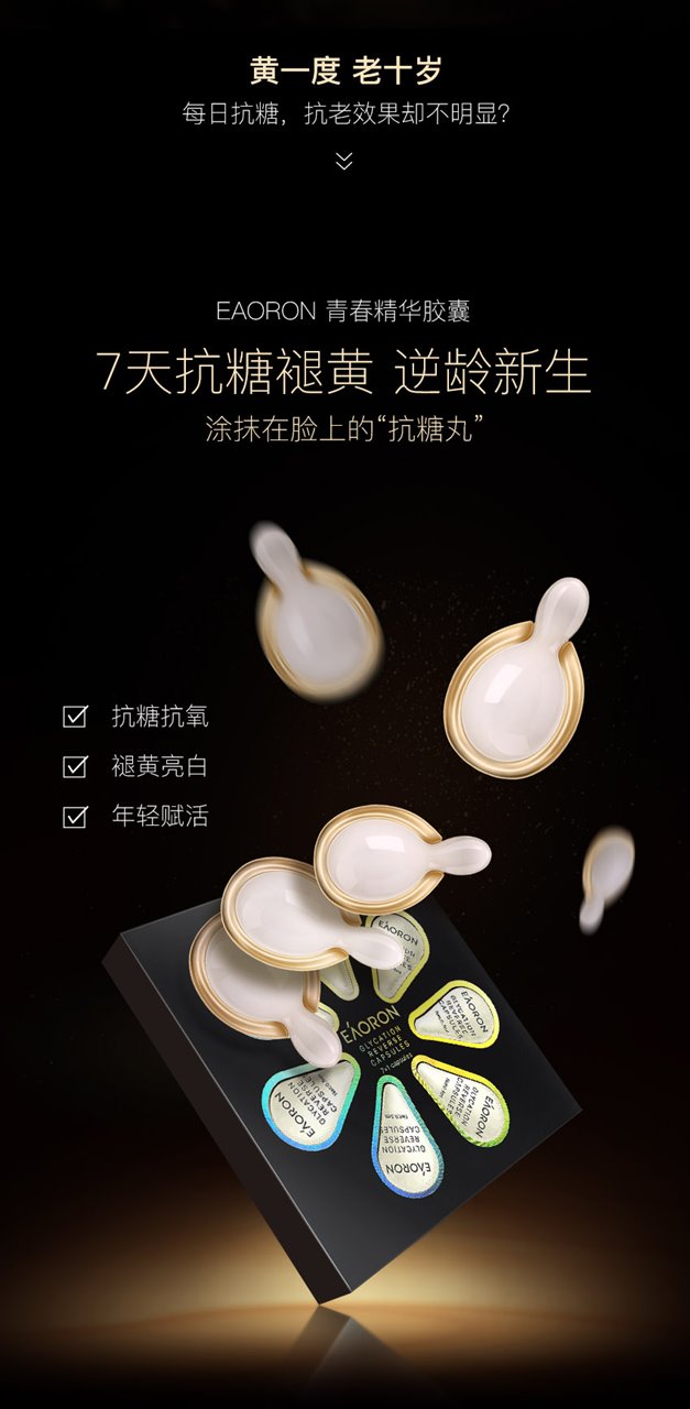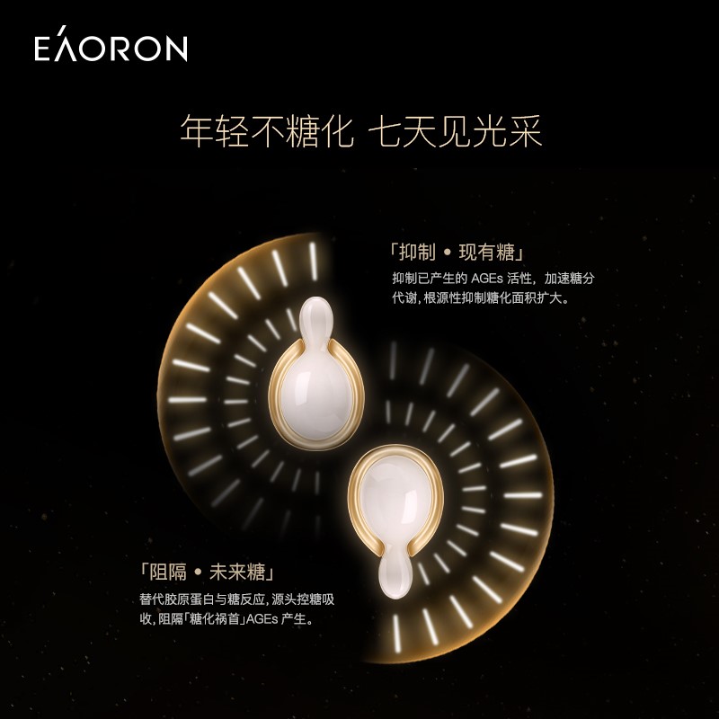 EAORON 抗糖黑科技——全球首款涂抹式抗糖丸!包含多项创新护肤科技,颠覆传统抗糖丸口服式的使用方法,突破抗糖丸单一的抗糖功效,双效抗糖因子同步抗糖抗氧化,只需使用7天,肌肤便重现年轻光彩,开创了肌肤抗糖新纪元。