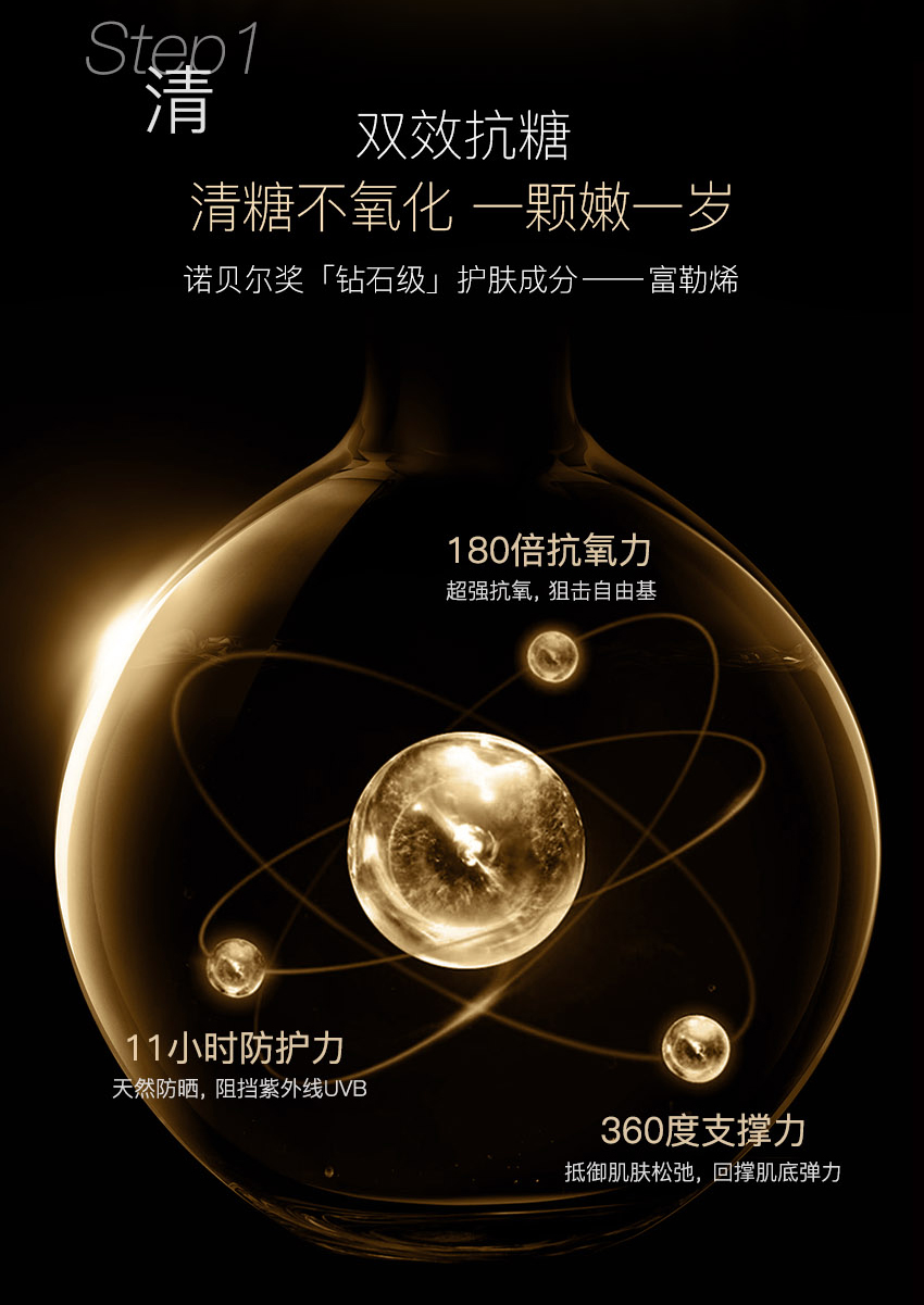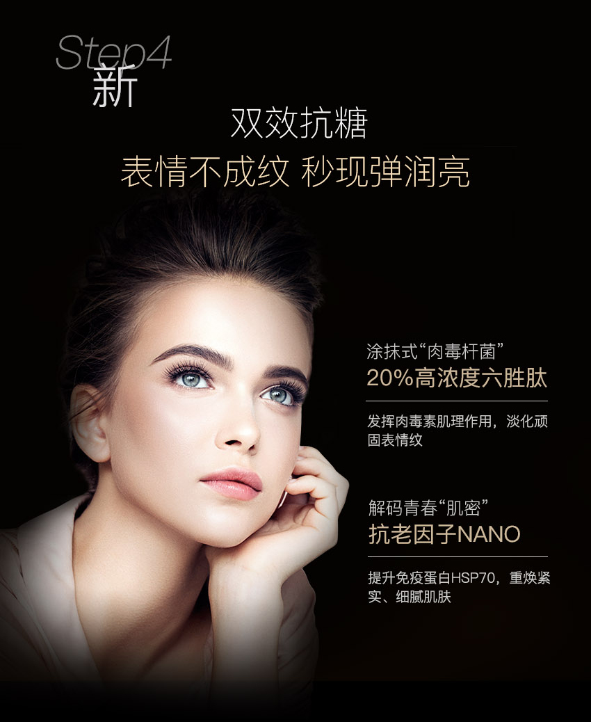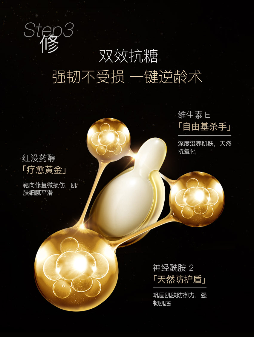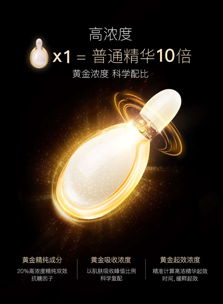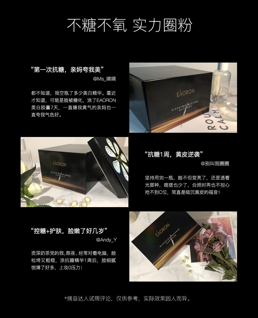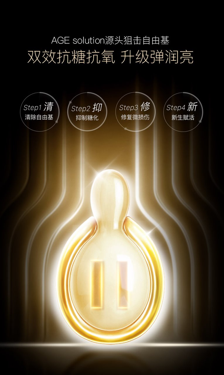 EAORON 抗糖黑科技——全球首款涂抹式抗糖丸!包含多项创新护肤科技,颠覆传统抗糖丸口服式的使用方法,突破抗糖丸单一的抗糖功效,双效抗糖因子同步抗糖抗氧化,只需使用7天,肌肤便重现年轻光彩,开创了肌肤抗糖新纪元。